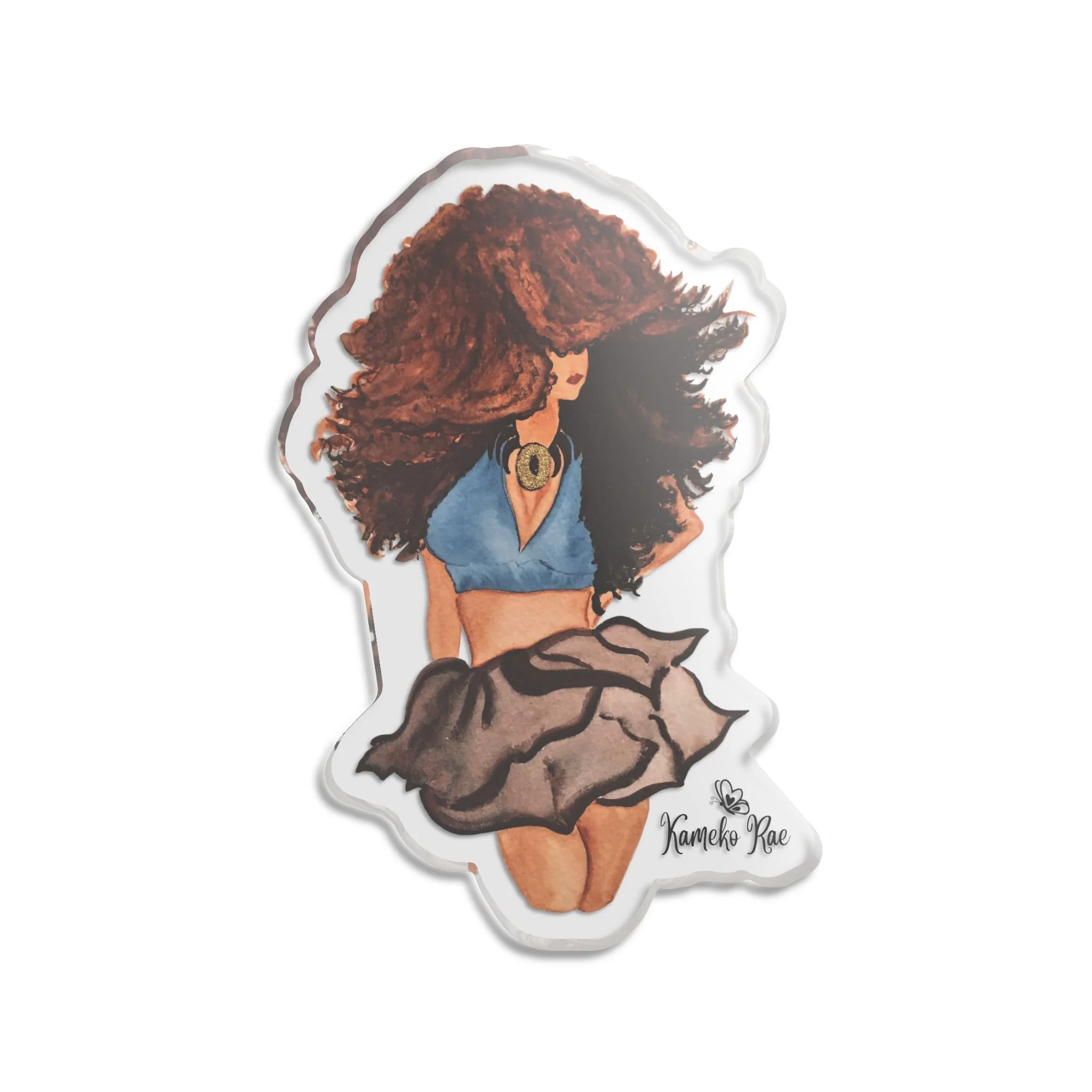 A small freestanding acrylic statue that brings a moment of movement and warmth to any shelf or desk. The thick, smooth-cut acrylic holds a mirror-like print that adds subtle depth and shine to the illustration — a flowing-skirt figure with voluminous hair captured mid-breeze. It sits securely on its own, catching light and reflecting tiny highlights that change with the room. Place it on a bedside table, an art nook, or a workspace to quietly celebrate bold hair, confident posture, and everyday elegance. Made in the USA and crafted for adults, this piece feels both personal and gallery-ready without taking up much space.