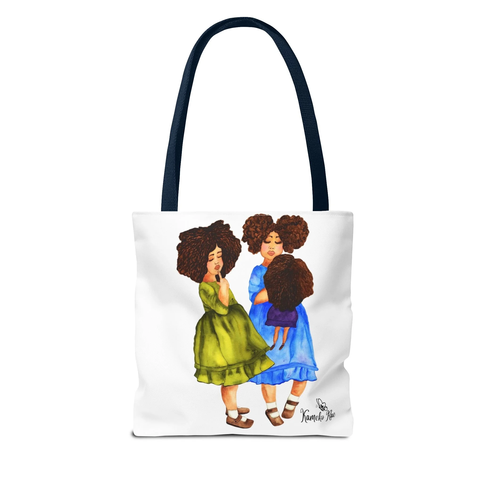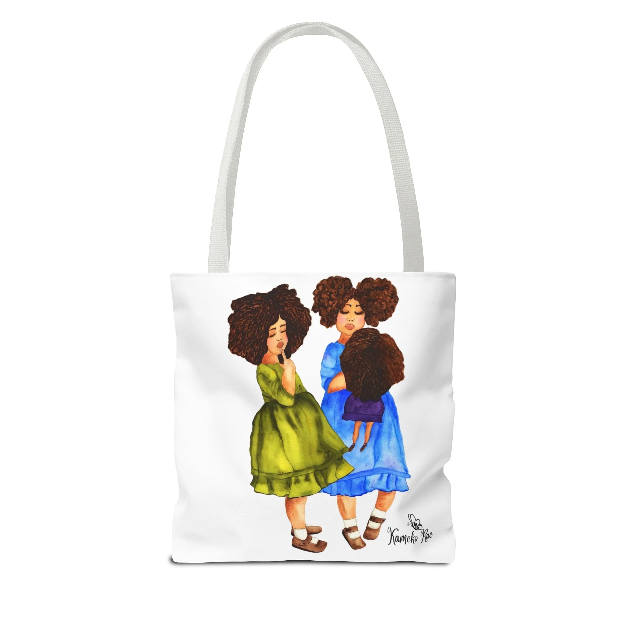 — it holds groceries, sketchbooks, or a laptop sleeve without losing its shape. The roomy boxed-corner silhouette and reinforced handles feel thoughtful and reliable; the artwork hangs like a small statement piece against the clean white background. It’s for people who celebrate bold hair, patterned fabrics, and everyday art in their daily routine.