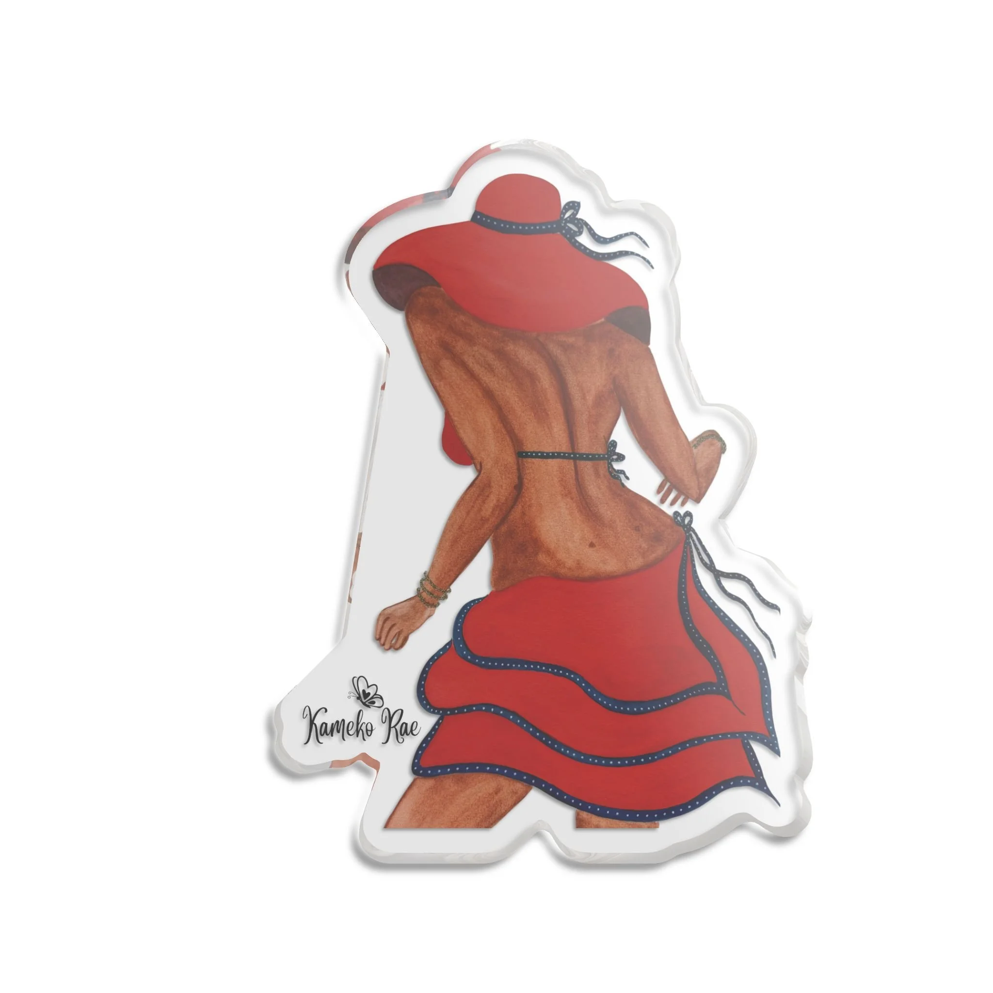 A small freestanding acrylic statue that brings a moment of movement and warmth to any shelf or desk. The thick, smooth-cut acrylic holds a mirror-like print that adds subtle depth and shine to the illustration — a flowing-skirt figure with voluminous hair captured mid-breeze. It sits securely on its own, catching light and reflecting tiny highlights that change with the room. Place it on a bedside table, an art nook, or a workspace to quietly celebrate bold hair, confident posture, and everyday elegance. Made in the USA and crafted for adults, this piece feels both personal and gallery-ready without taking up much space.
