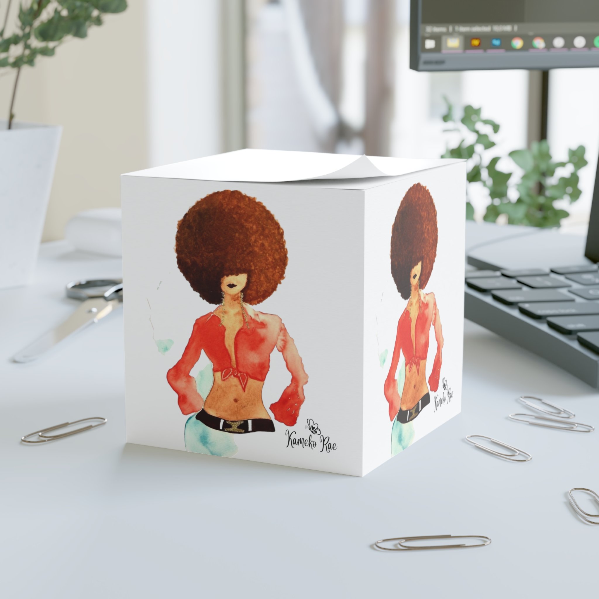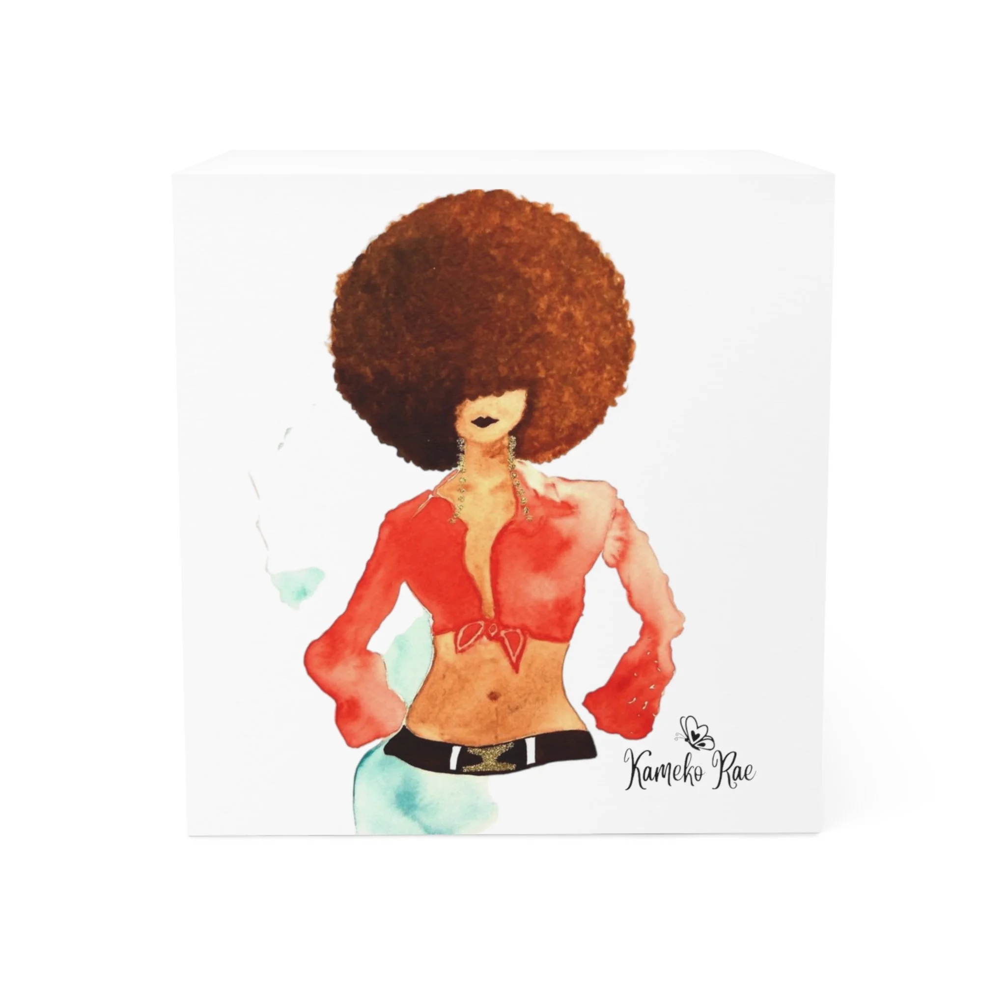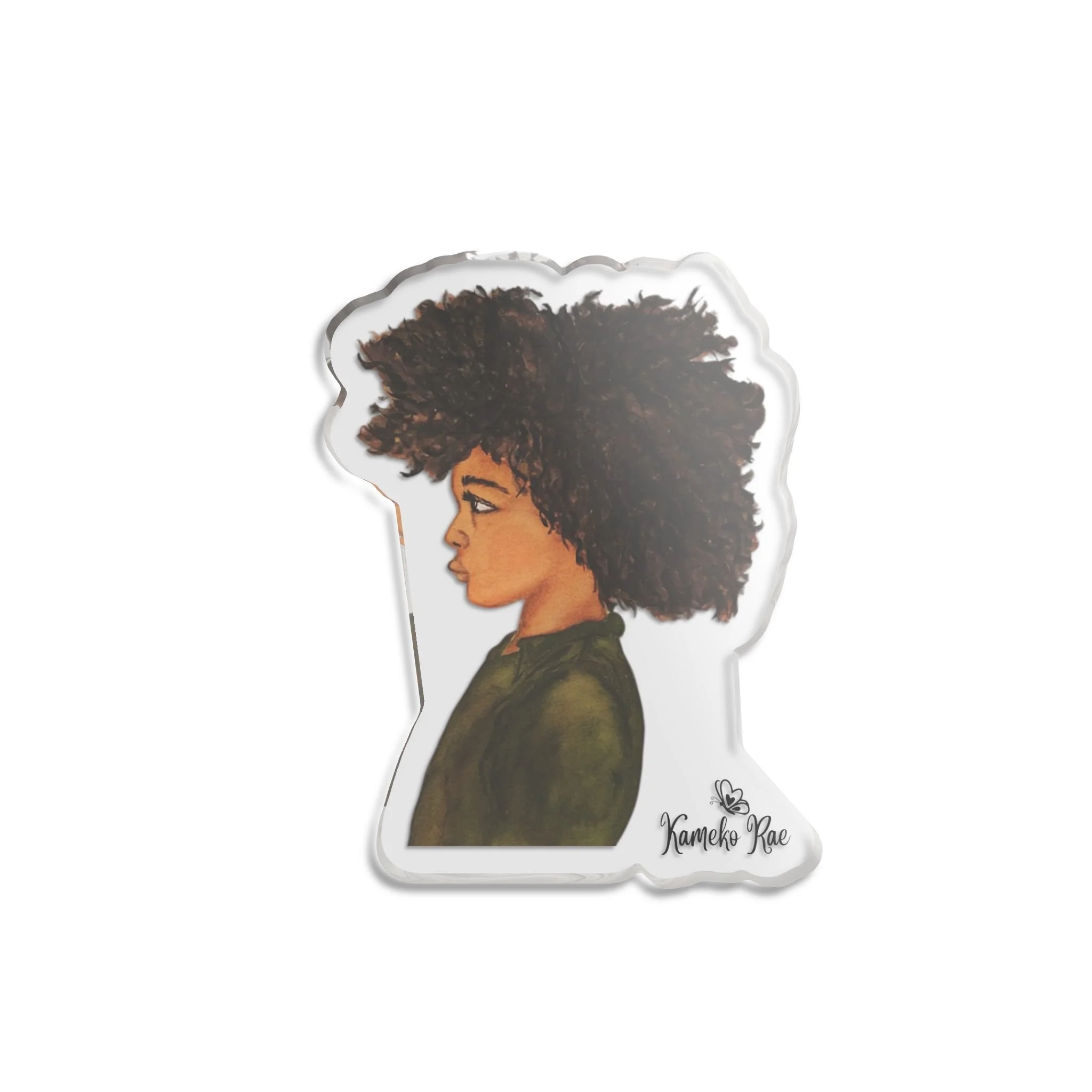 A small freestanding acrylic statue that brings a moment of movement and warmth to any shelf or desk. The thick, smooth-cut acrylic holds a mirror-like print that adds subtle depth and shine to the illustration — a flowing-skirt figure with voluminous hair captured mid-breeze. It sits securely on its own, catching light and reflecting tiny highlights that change with the room. Place it on a bedside table, an art nook, or a workspace to quietly celebrate bold hair, confident posture, and everyday elegance. Made in the USA and crafted for adults, this piece feels both personal and gallery-ready without taking up much space.