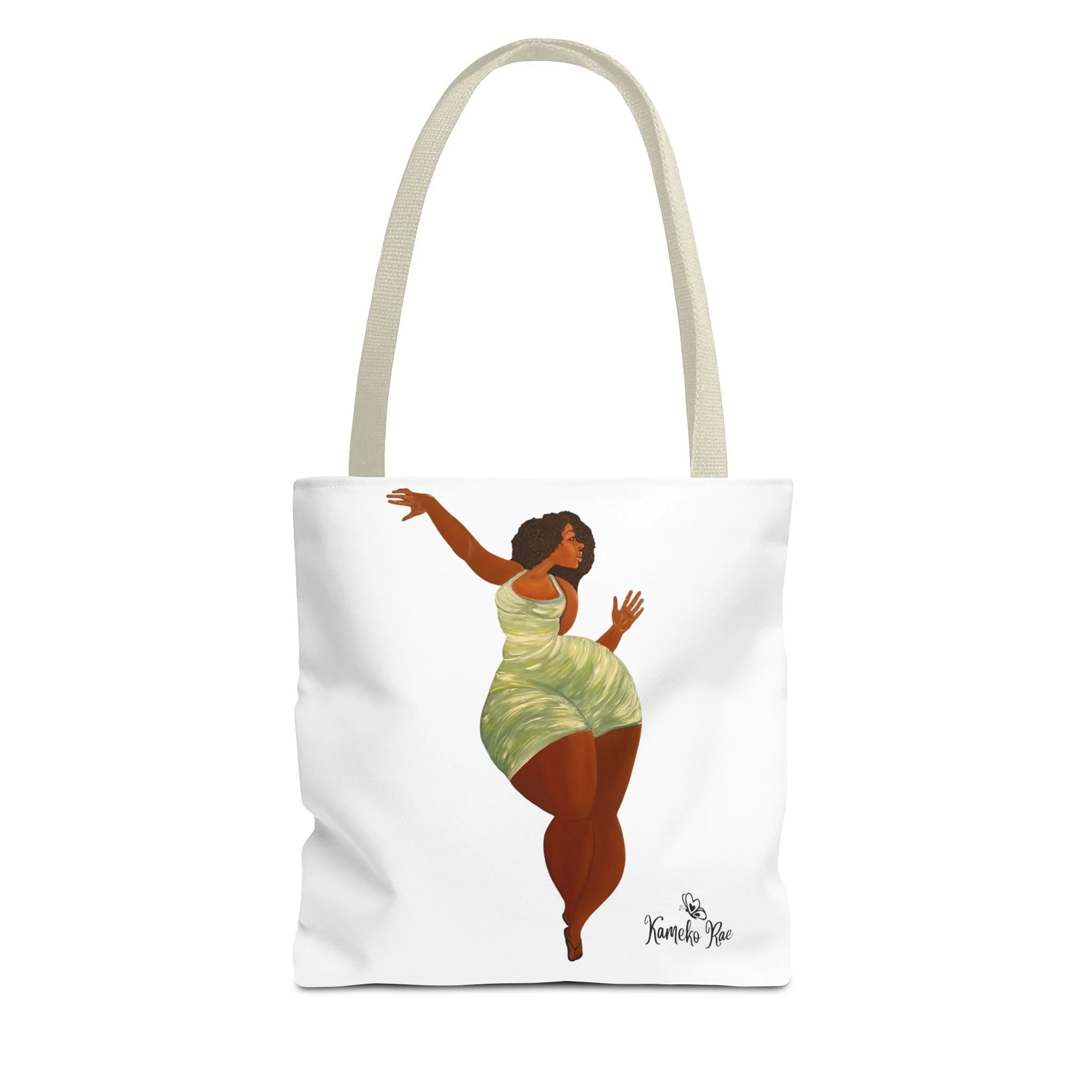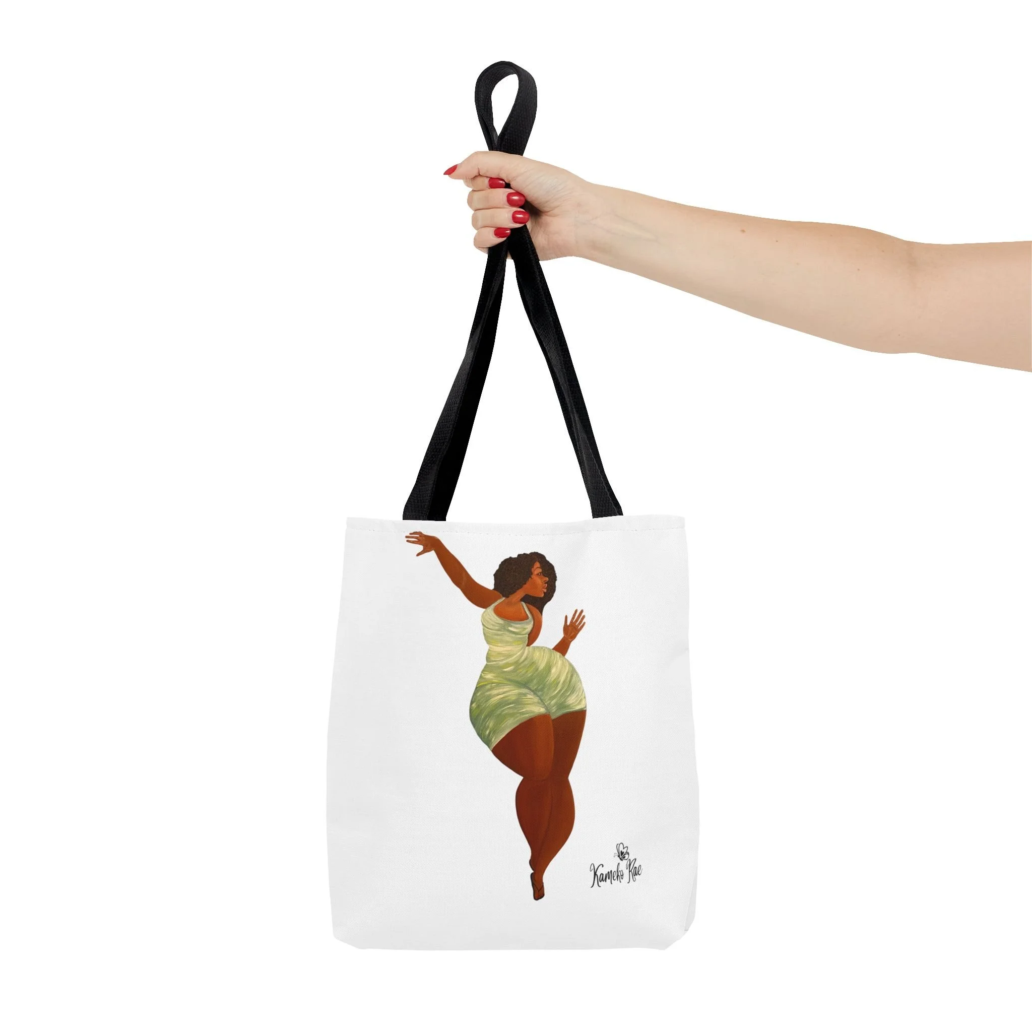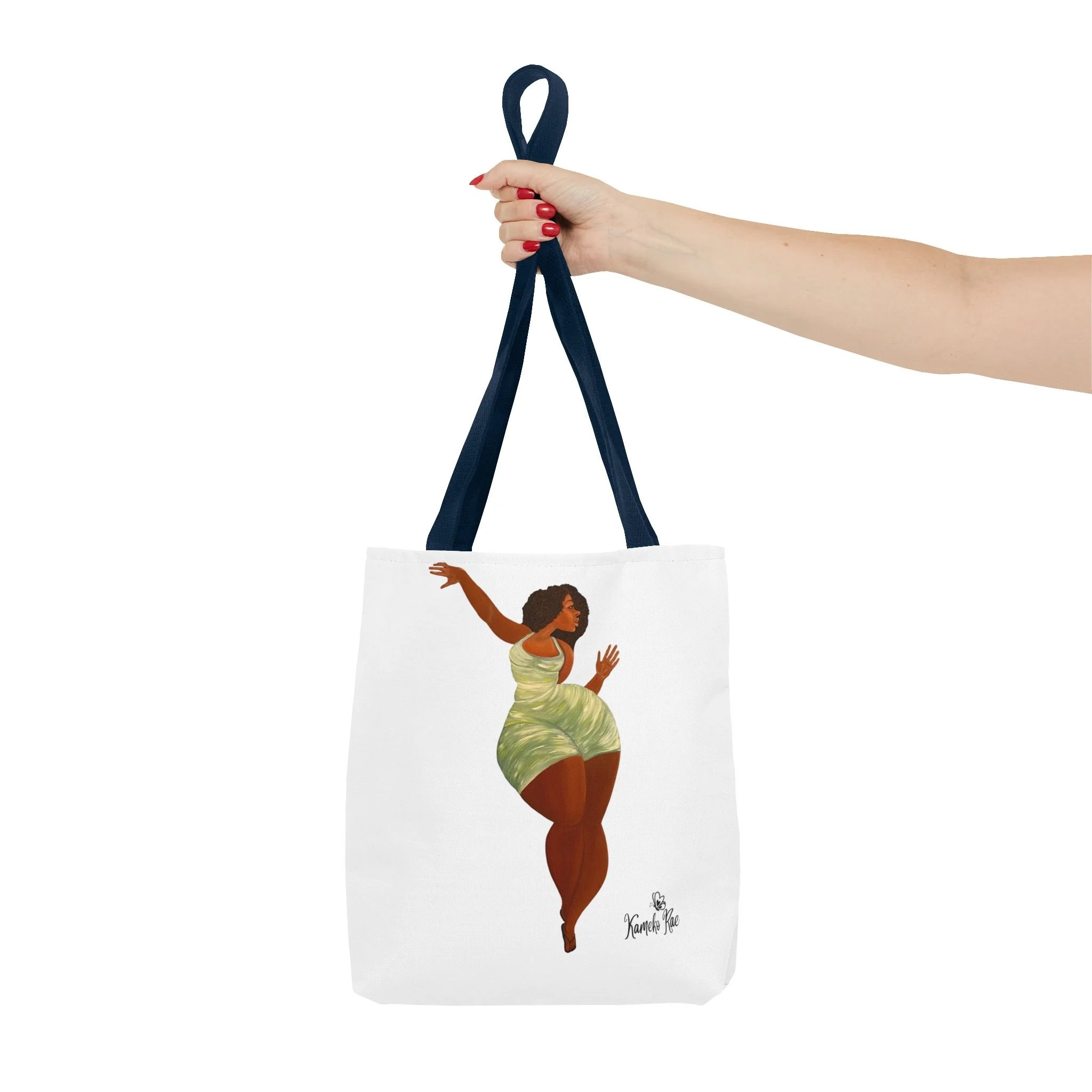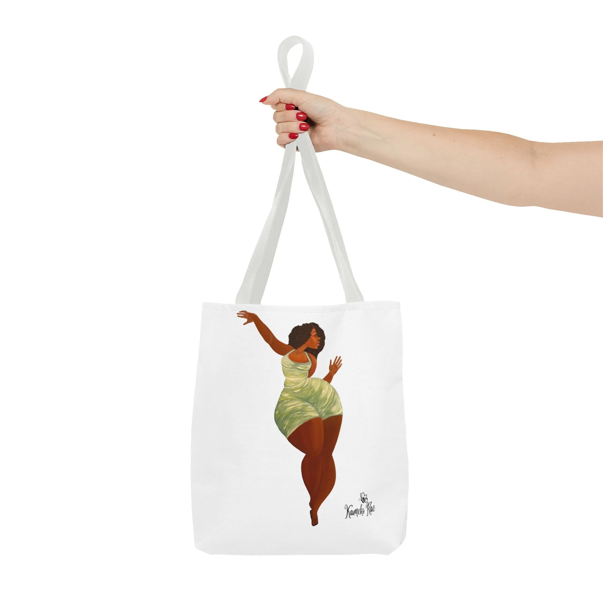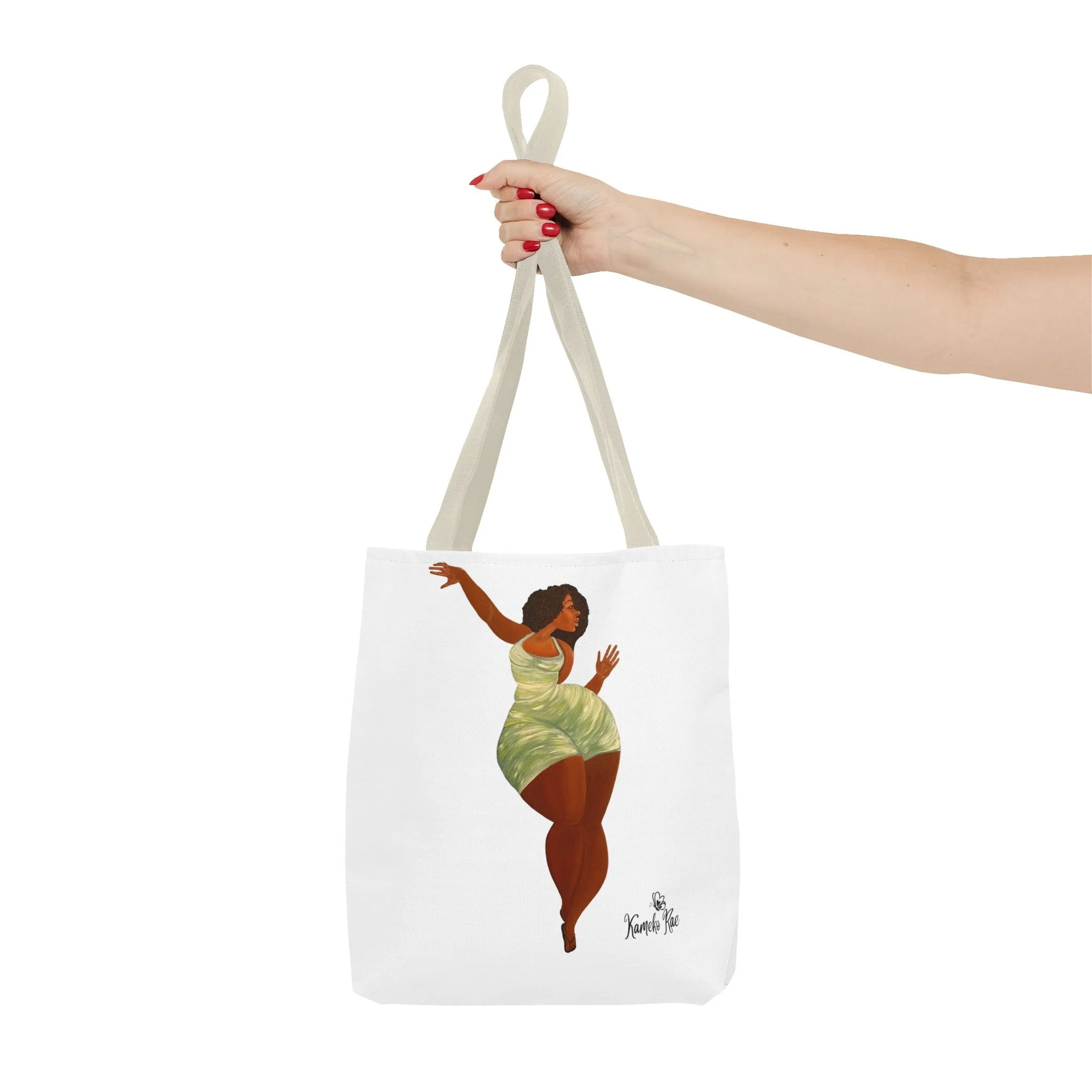 — it holds groceries, sketchbooks, or a laptop sleeve without losing its shape. The roomy boxed-corner silhouette and reinforced handles feel thoughtful and reliable; the artwork hangs like a small statement piece against the clean white background. It’s for people who celebrate bold hair, patterned fabrics, and everyday art in their daily routine.