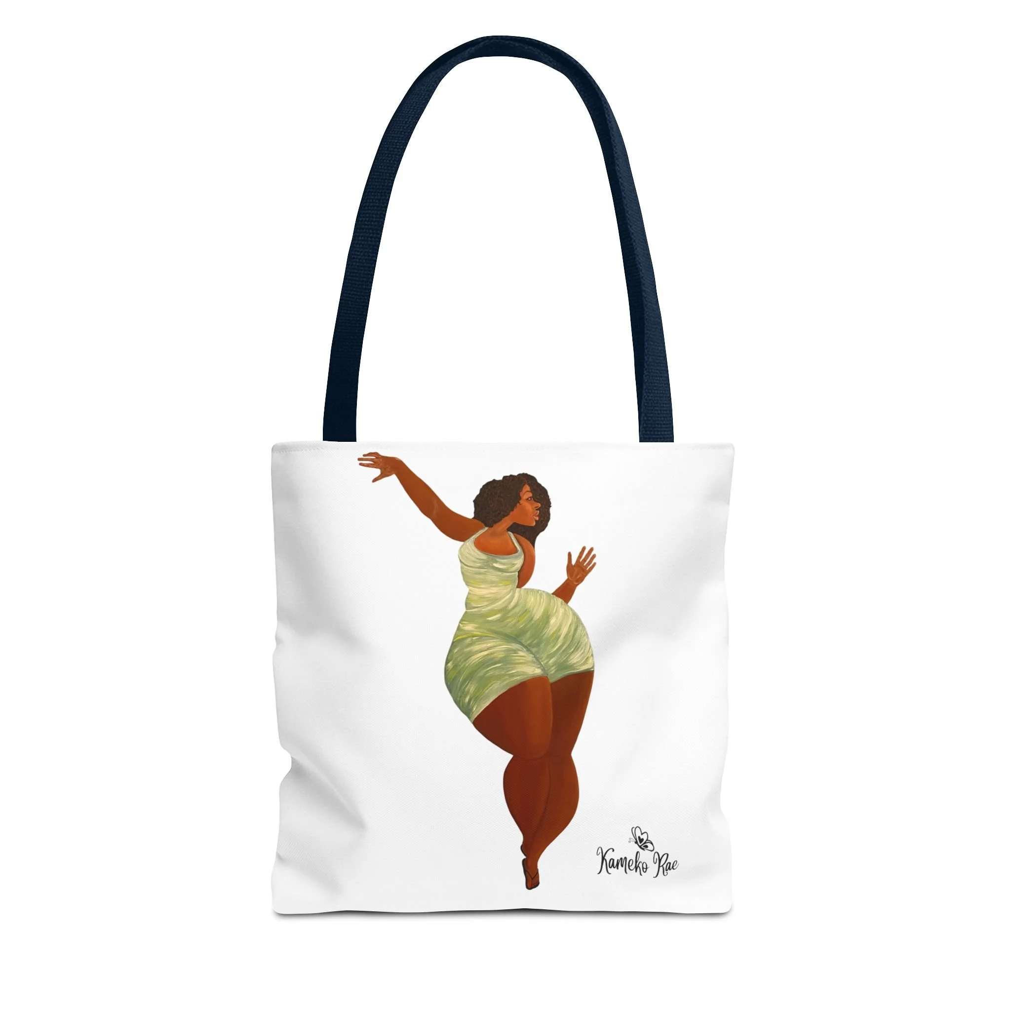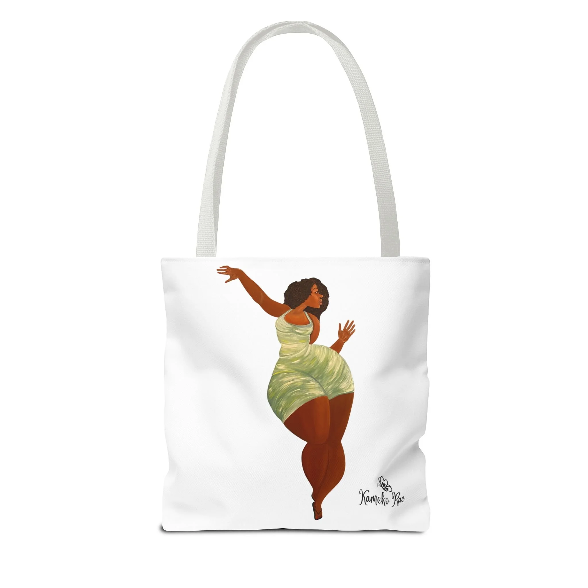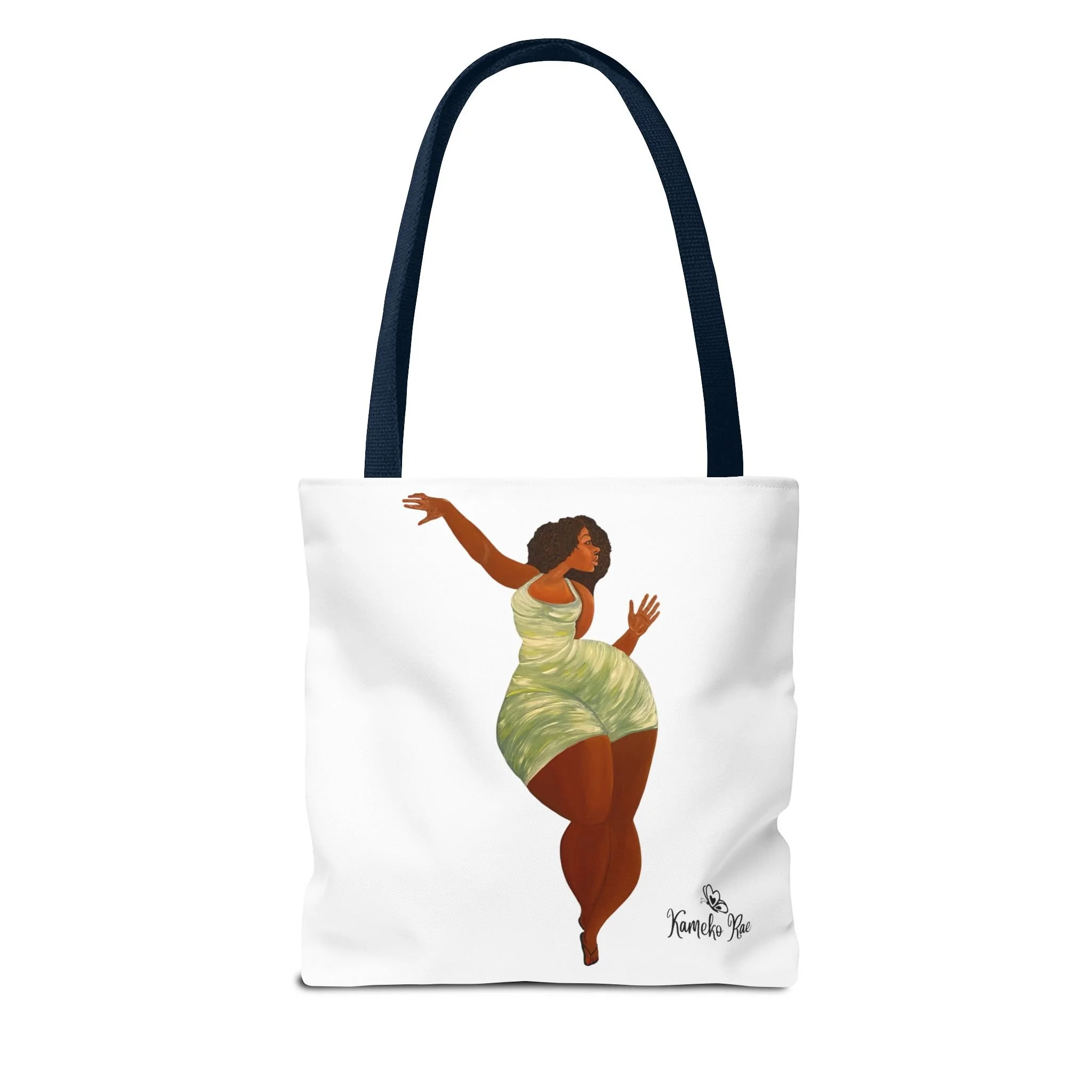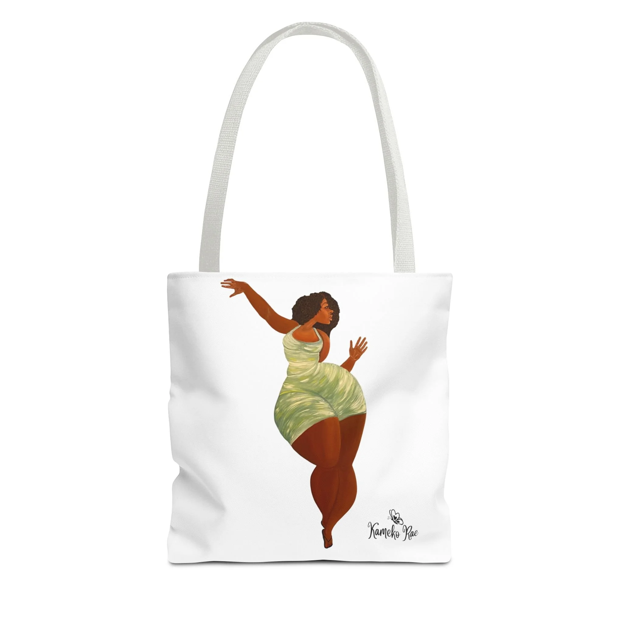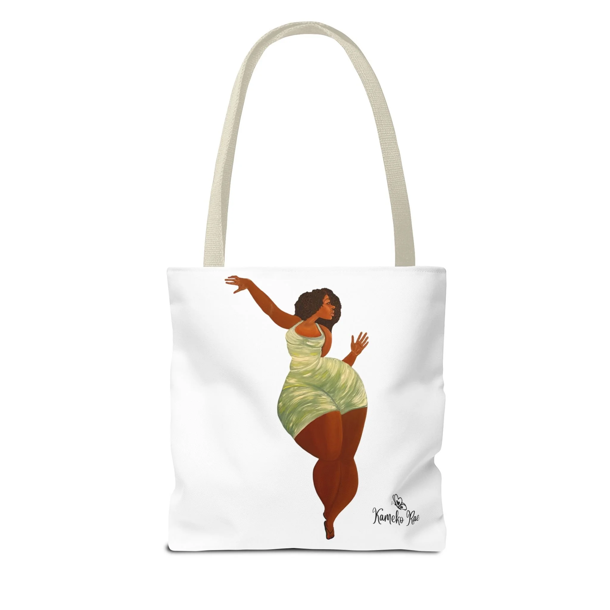— it holds groceries, sketchbooks, or a laptop sleeve without losing its shape. The roomy boxed-corner silhouette and reinforced handles feel thoughtful and reliable; the artwork hangs like a small statement piece against the clean white background. It’s for people who celebrate bold hair, patterned fabrics, and everyday art in their daily routine.