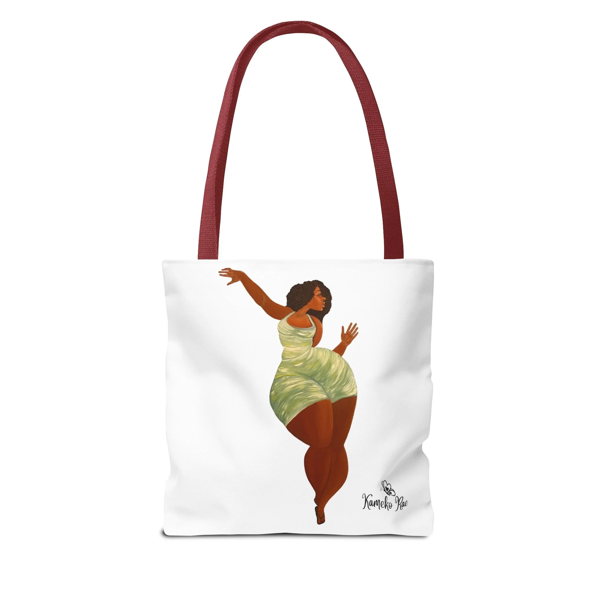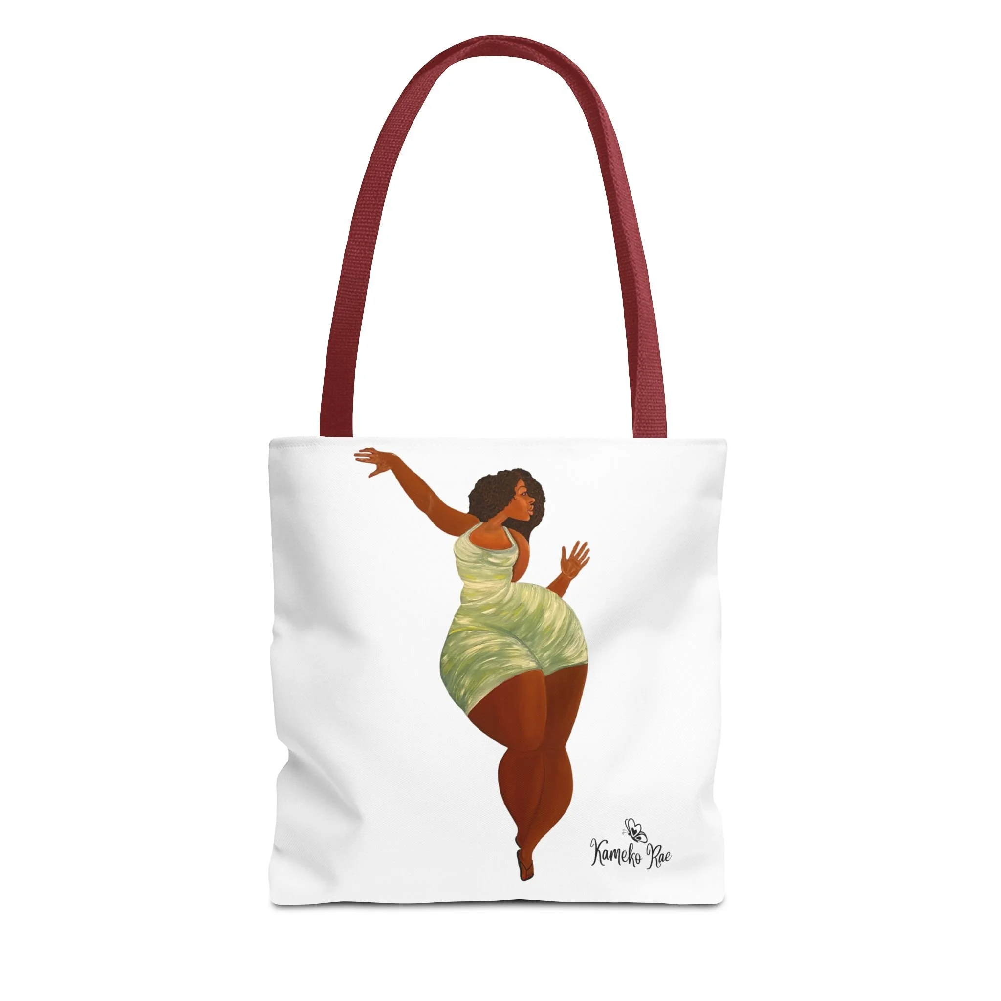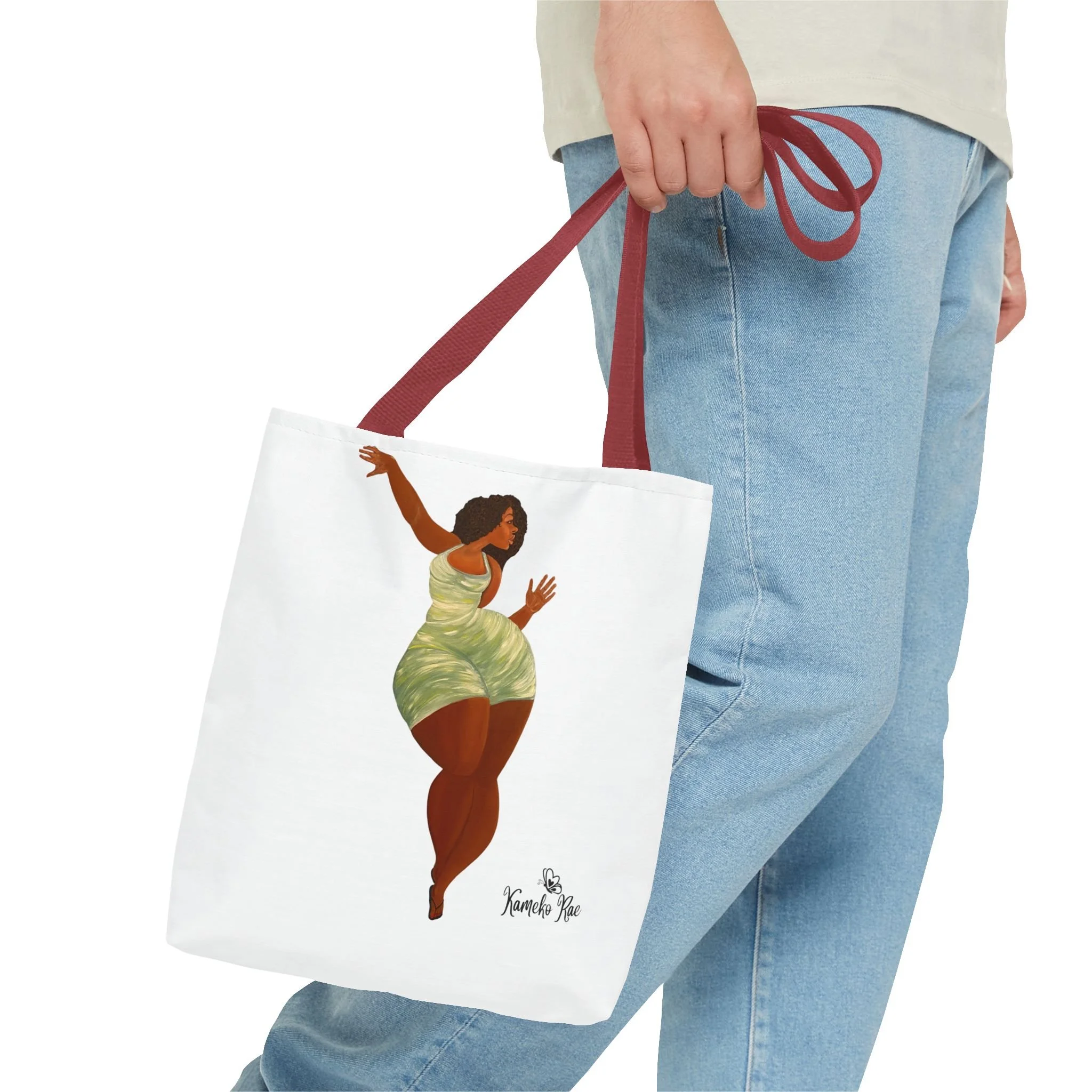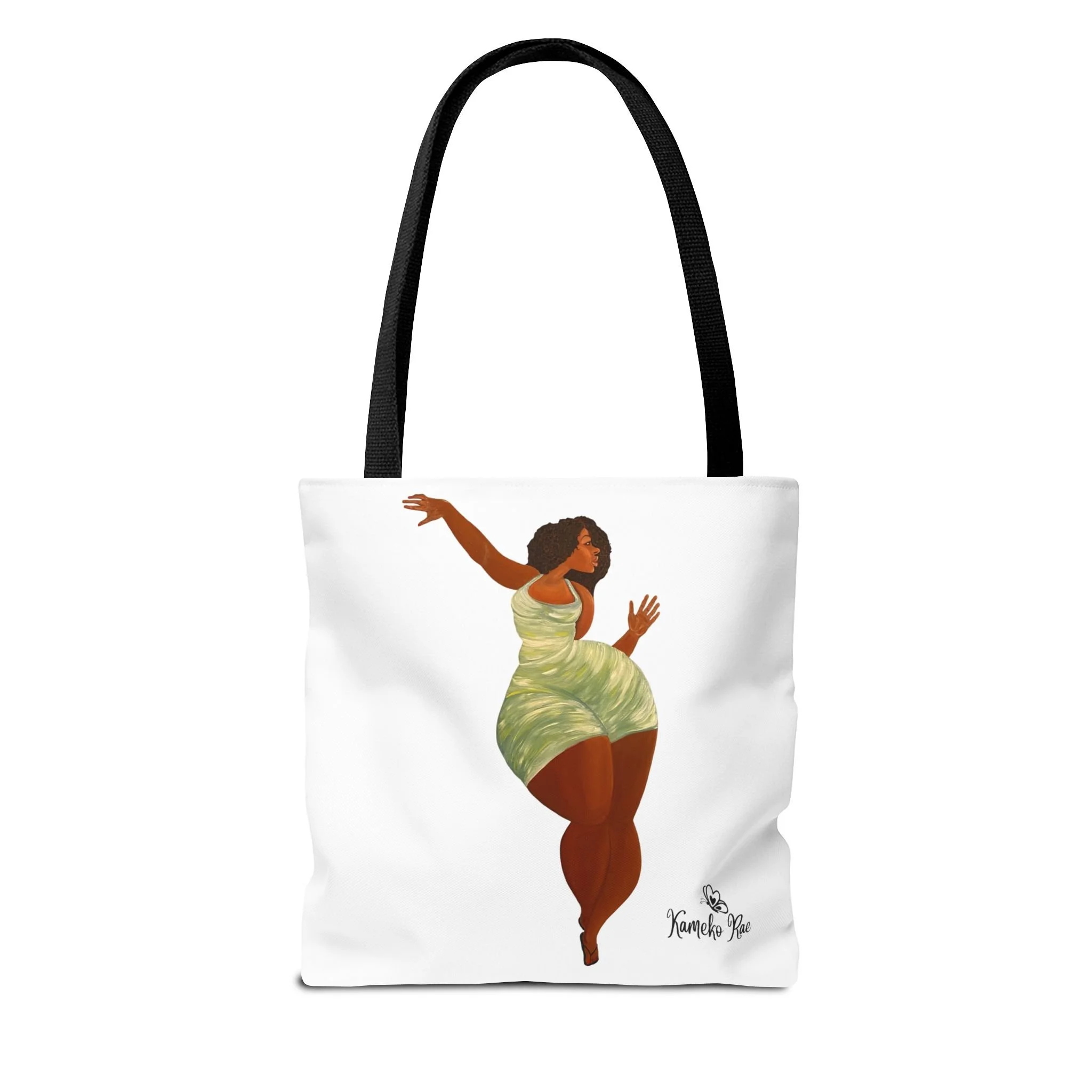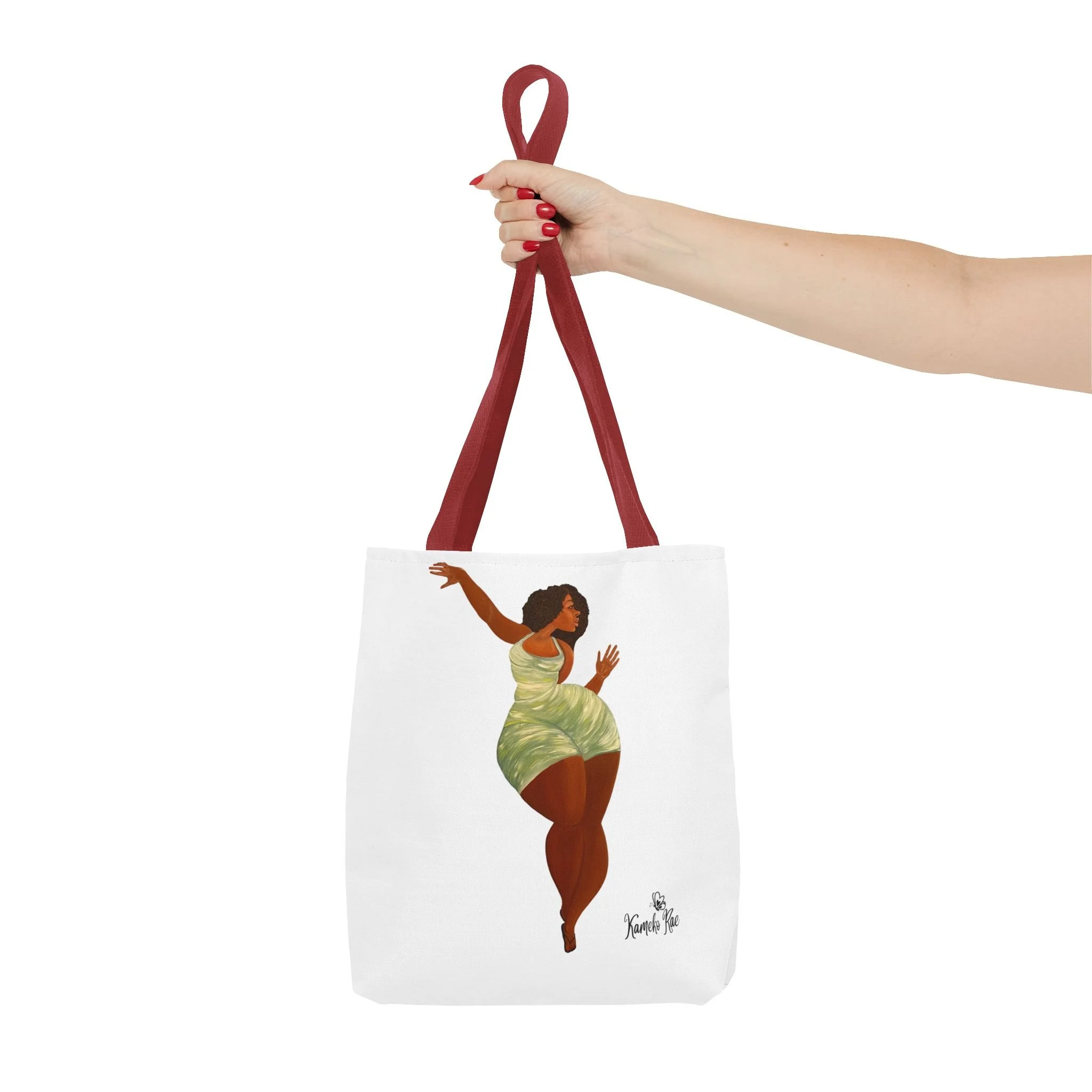 — it holds groceries, sketchbooks, or a laptop sleeve without losing its shape. The roomy boxed-corner silhouette and reinforced handles feel thoughtful and reliable; the artwork hangs like a small statement piece against the clean white background. It’s for people who celebrate bold hair, patterned fabrics, and everyday art in their daily routine.