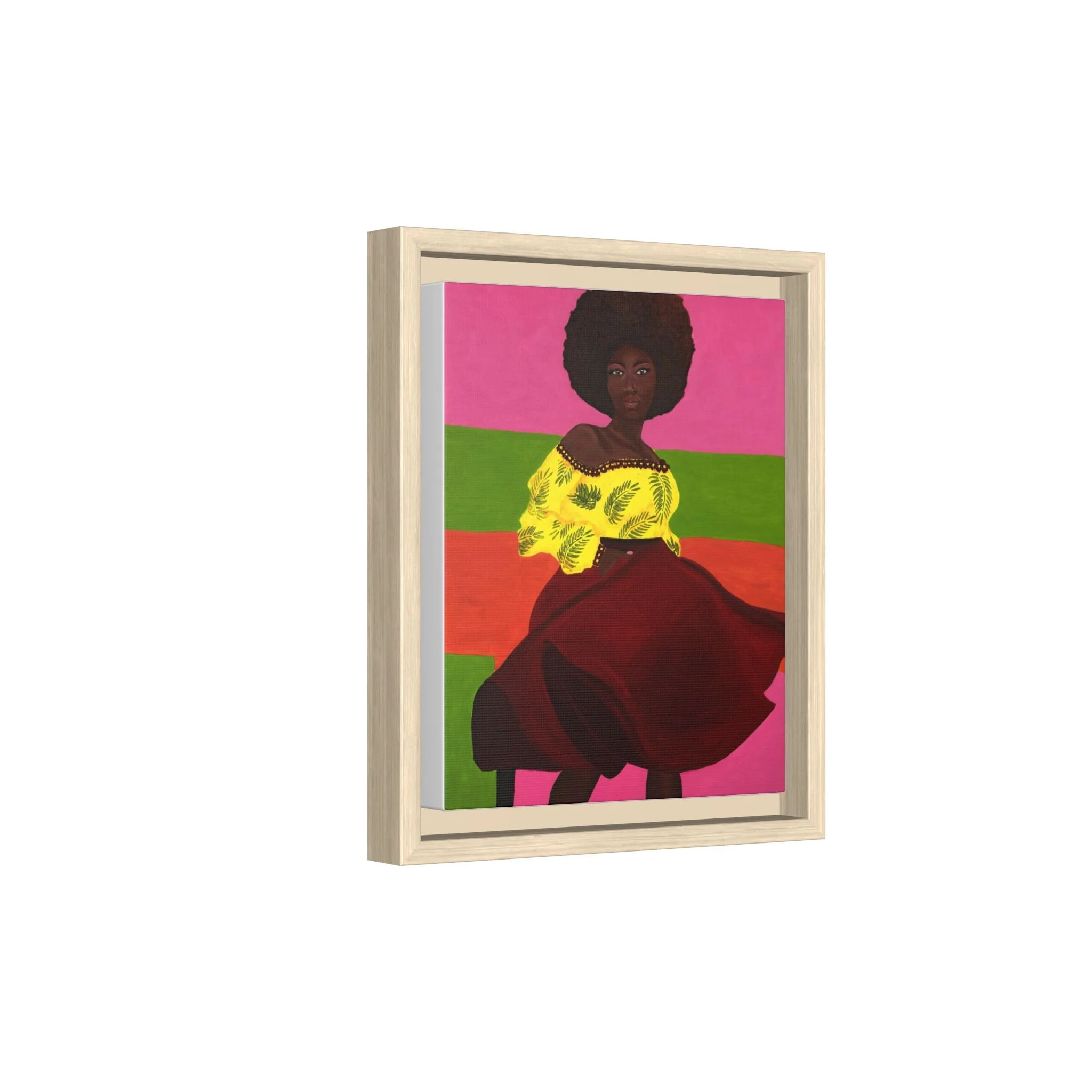 A framed matte canvas that brings bold color and warm presence to any room. The print features a confident, graceful figure set against broad bands of pink, green, and orange—vivid hues that pop with the canvas’s special coating and UL-certified Greenguard Gold inks. The natural pine frame adds an organic edge, keeping the piece grounded and gallery-ready. It hangs easily with sawtooth hardware and comes in multiple orientations and sizes to suit living rooms, entryways, studios, or cozy reading nooks. The result is a lively, soulful artwork that feels lived-in and luminous at once.