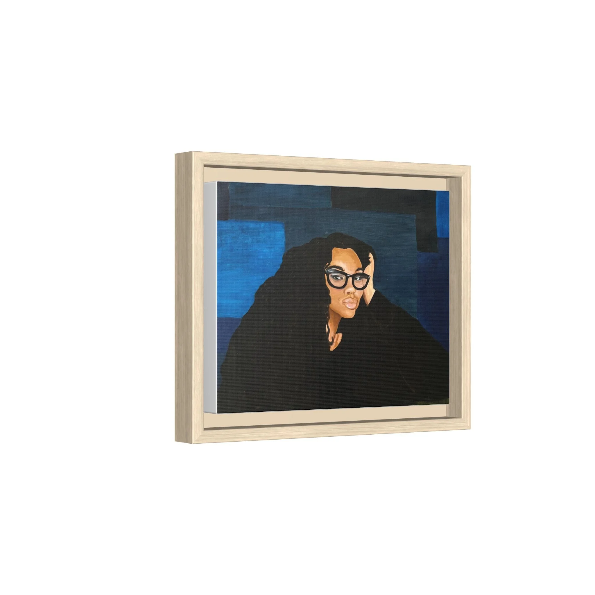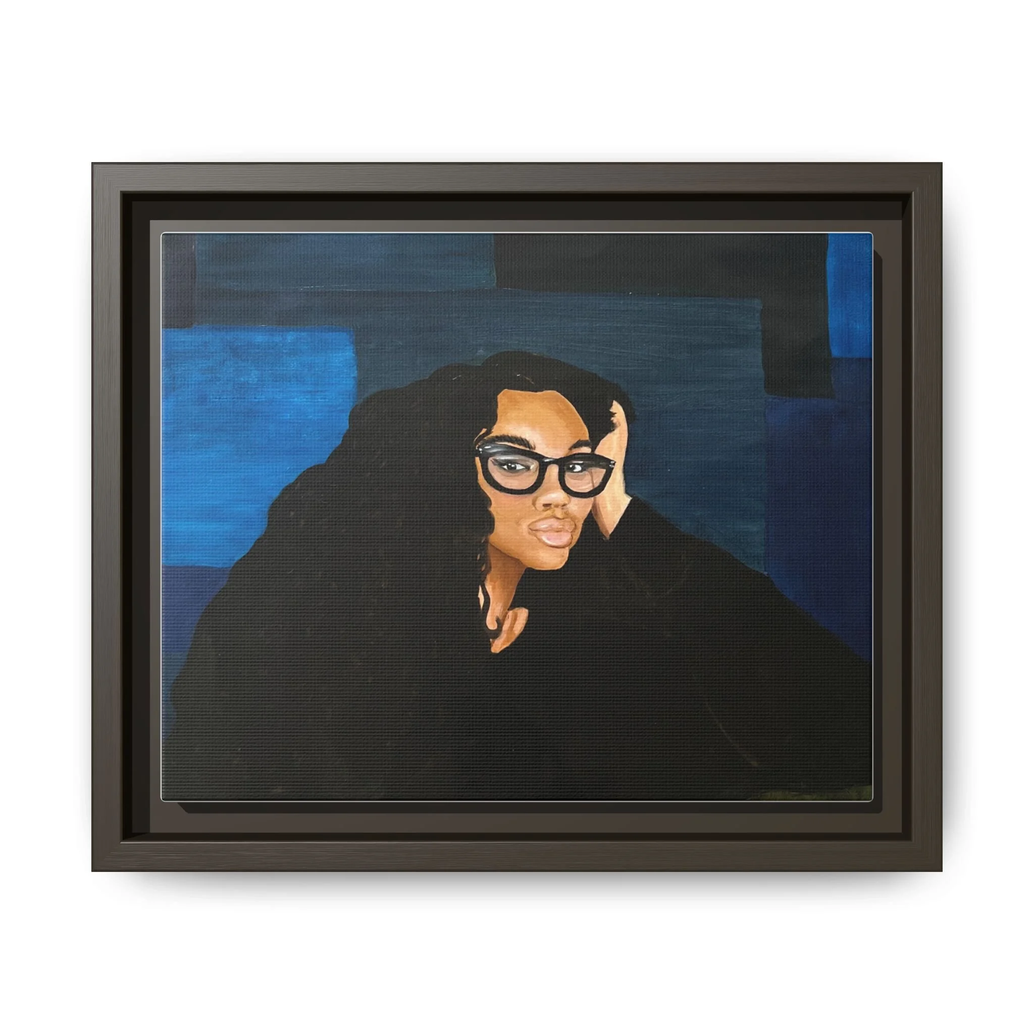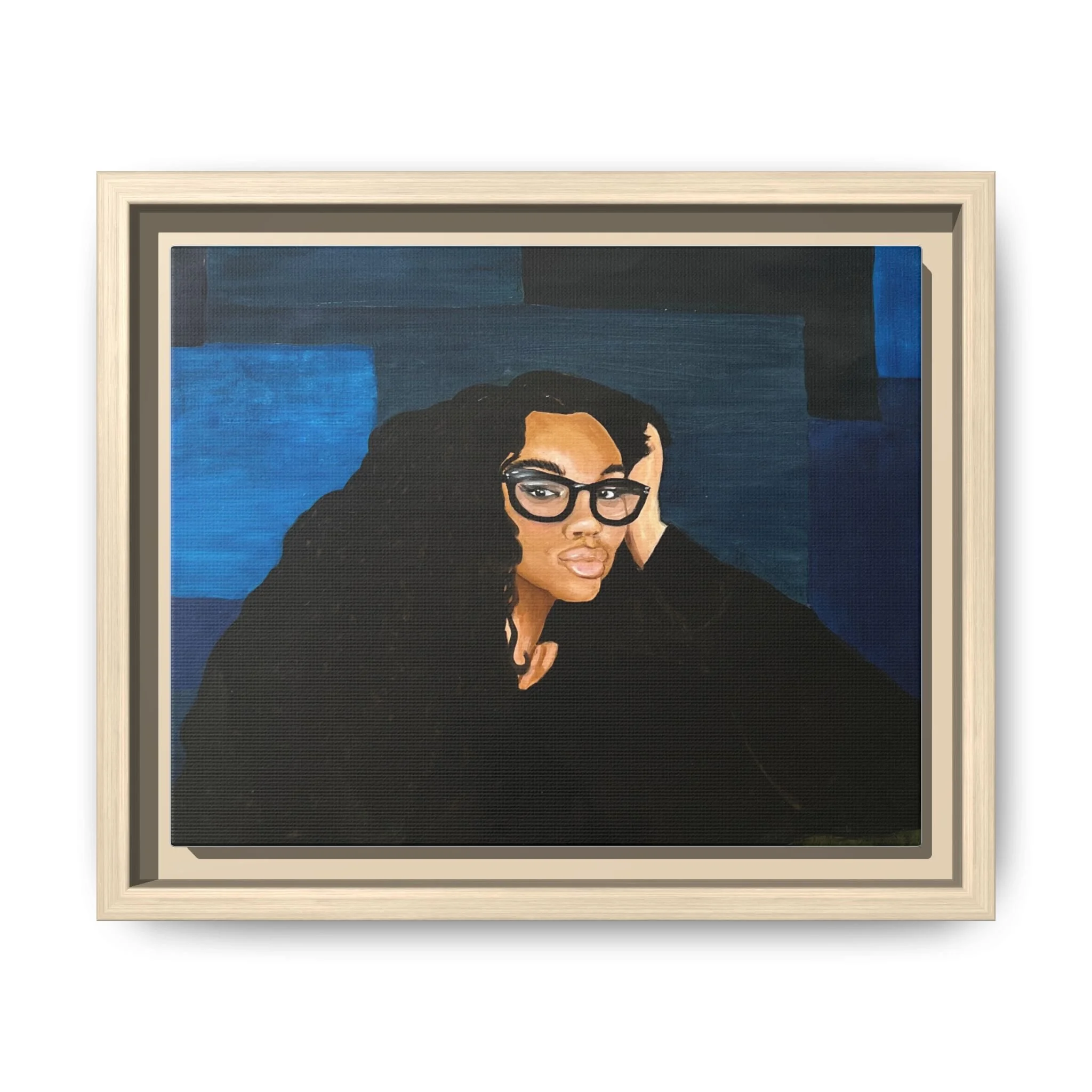 A framed matte canvas print that brings quiet confidence and modern portraiture into your space. The rich navy and deep blacks create a calm, contemplative mood while warm skin tones and glossy glasses draw the eye. Mounted on a light pine frame and finished with a smooth matte coating, this piece reduces glare and emphasizes painterly texture. Hang it above a reading nook, in a home office, or on a gallery wall to anchor a room with subtle drama and soulful presence. The sustainable materials and archival latex inks ensure the colors stay vivid without harsh chemical odors, so the artwork feels both elevated and comfortably lived-in.