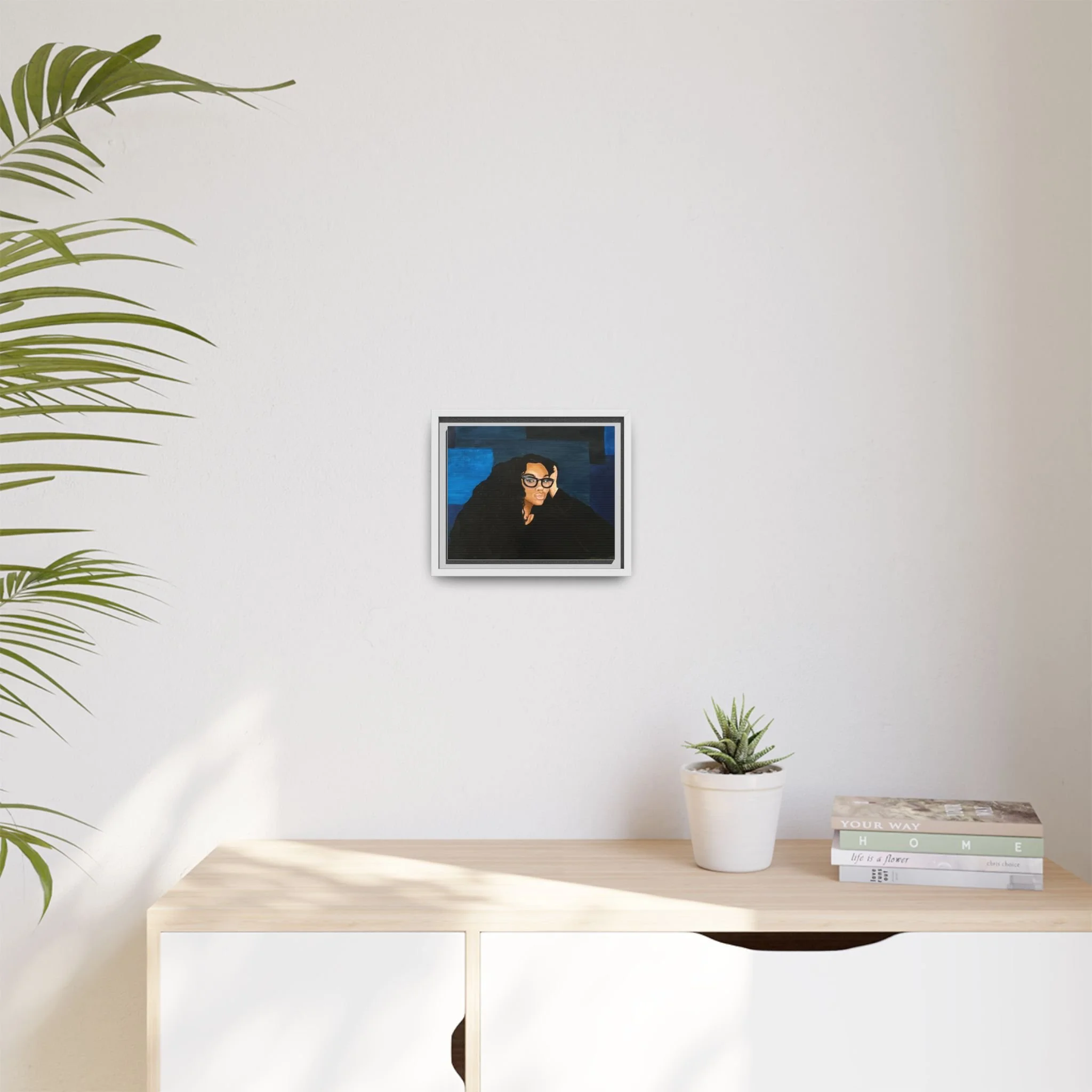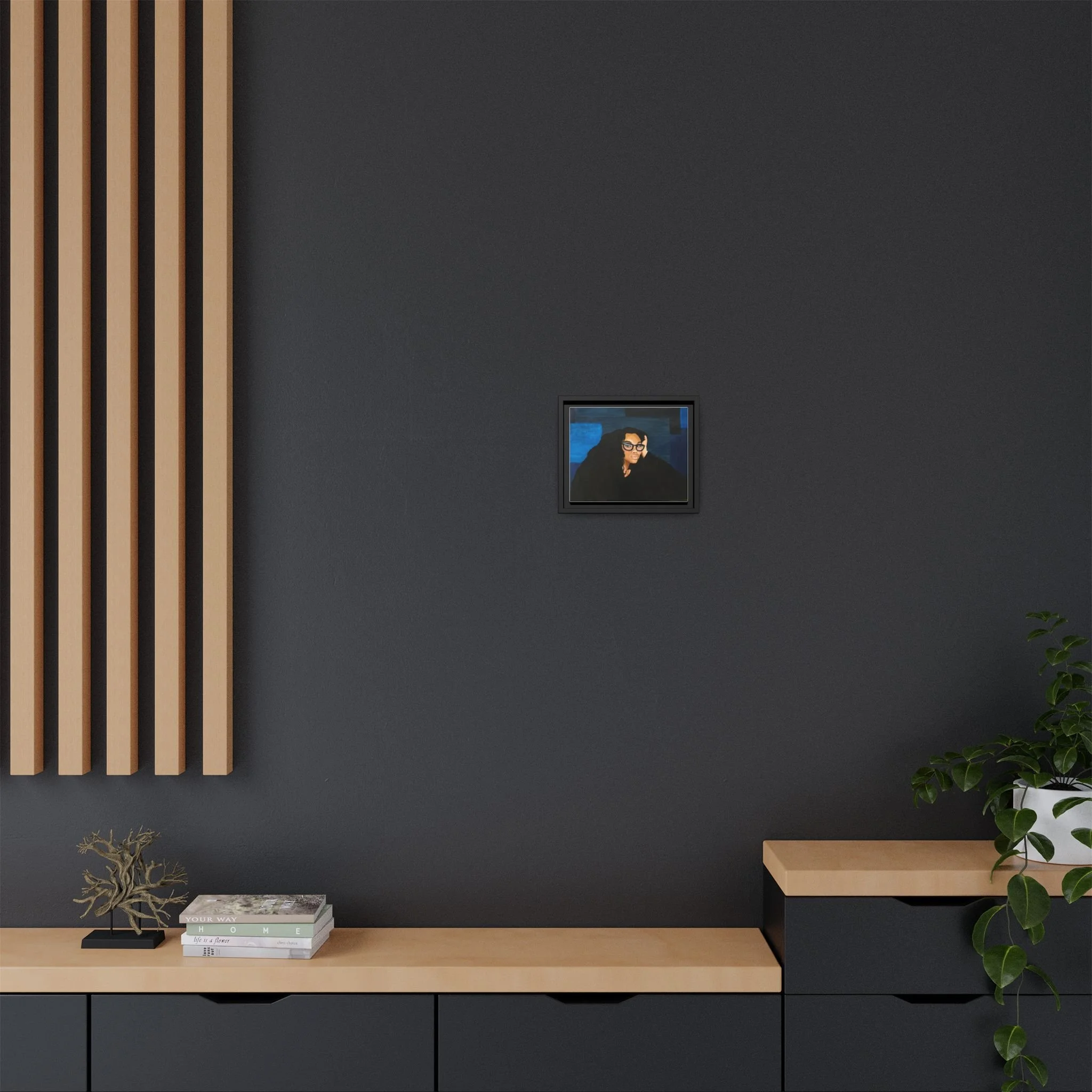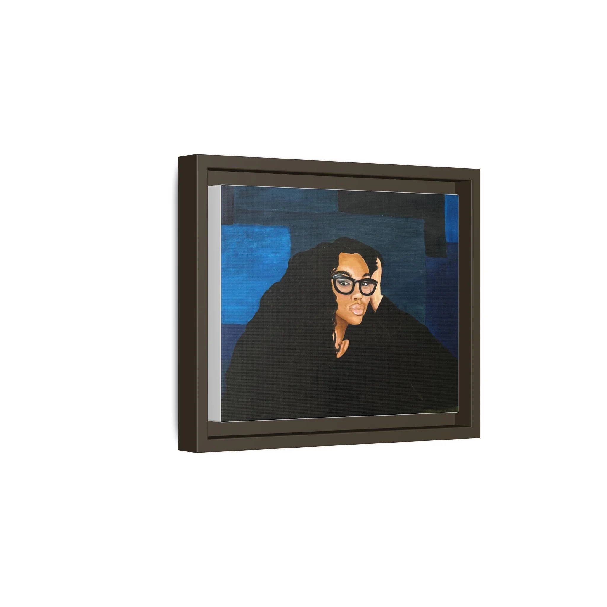A framed matte canvas print that brings quiet confidence and modern portraiture into your space. The rich navy and deep blacks create a calm, contemplative mood while warm skin tones and glossy glasses draw the eye. Mounted on a light pine frame and finished with a smooth matte coating, this piece reduces glare and emphasizes painterly texture. Hang it above a reading nook, in a home office, or on a gallery wall to anchor a room with subtle drama and soulful presence. The sustainable materials and archival latex inks ensure the colors stay vivid without harsh chemical odors, so the artwork feels both elevated and comfortably lived-in.