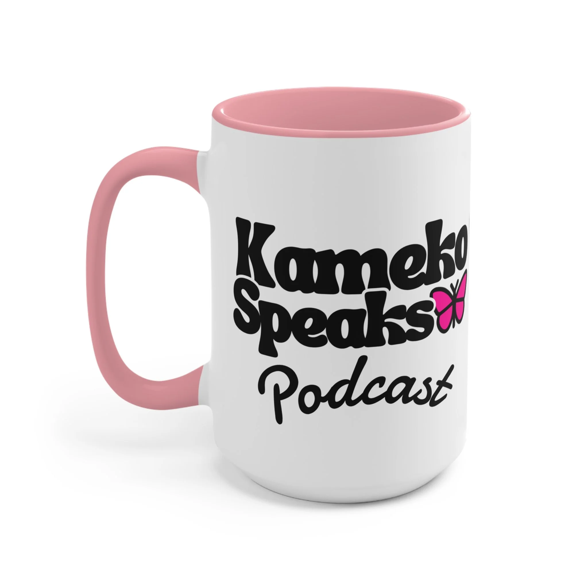 Kameko Speaks Podcast Accent Mug – Pink Interior & Handle, Branded Podcast Coffee Cup