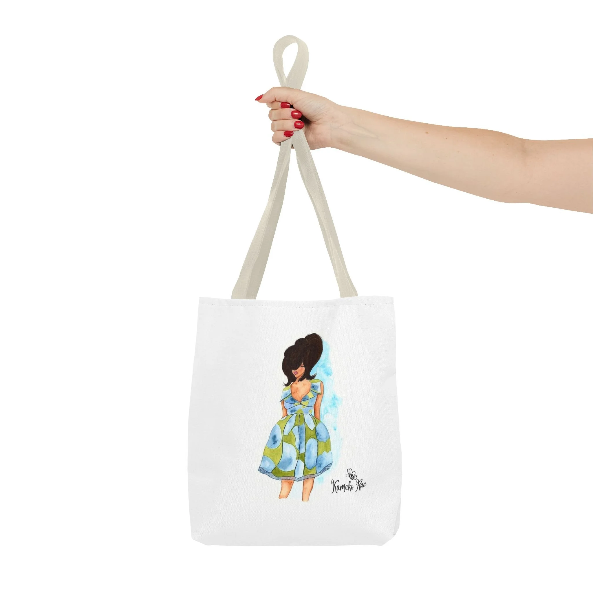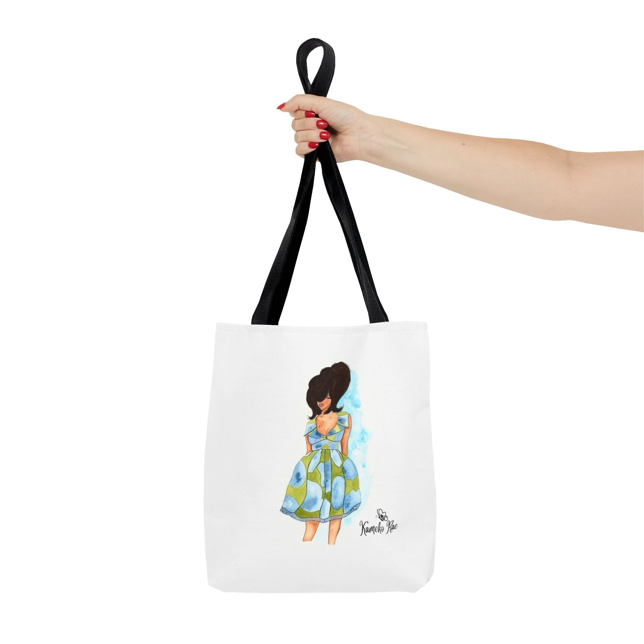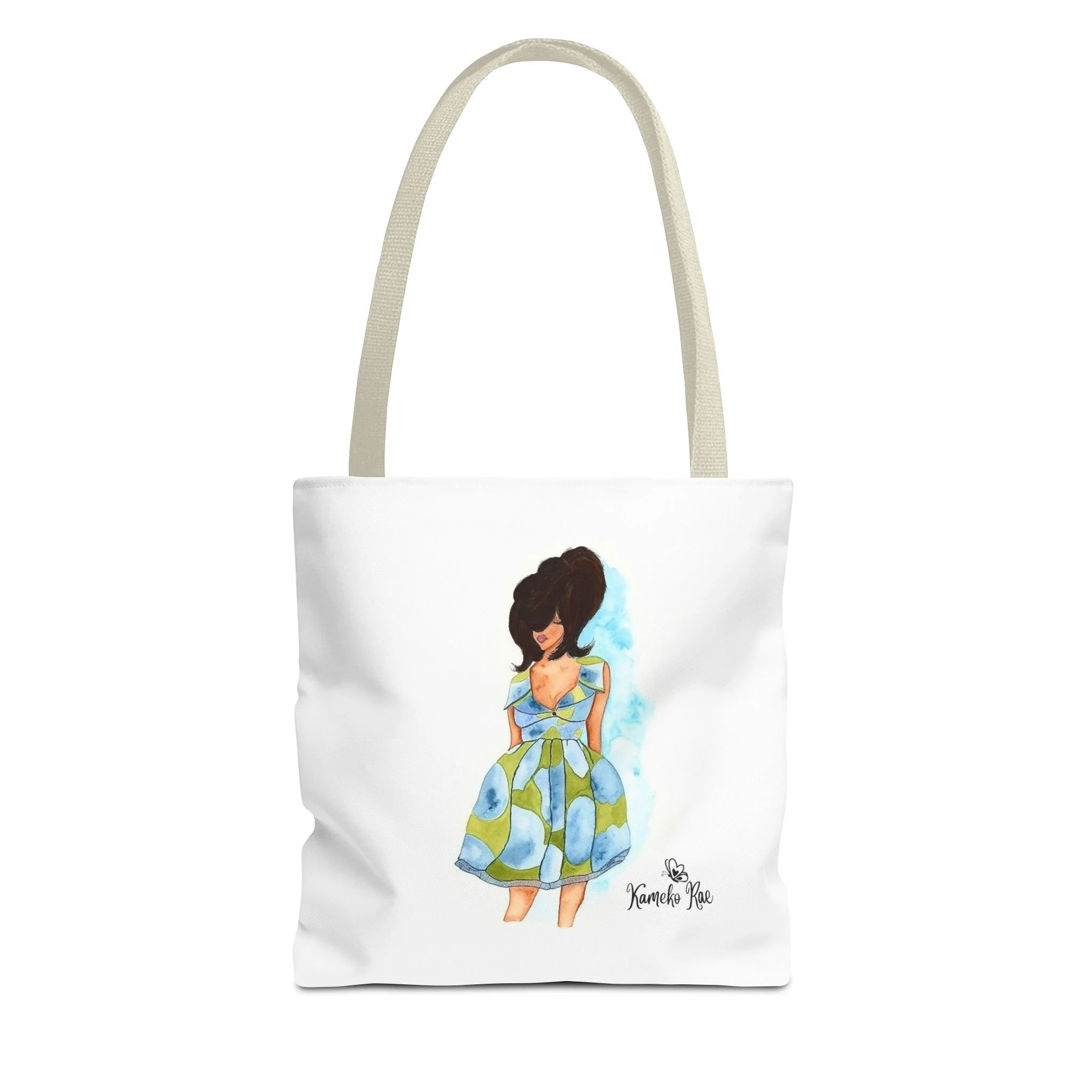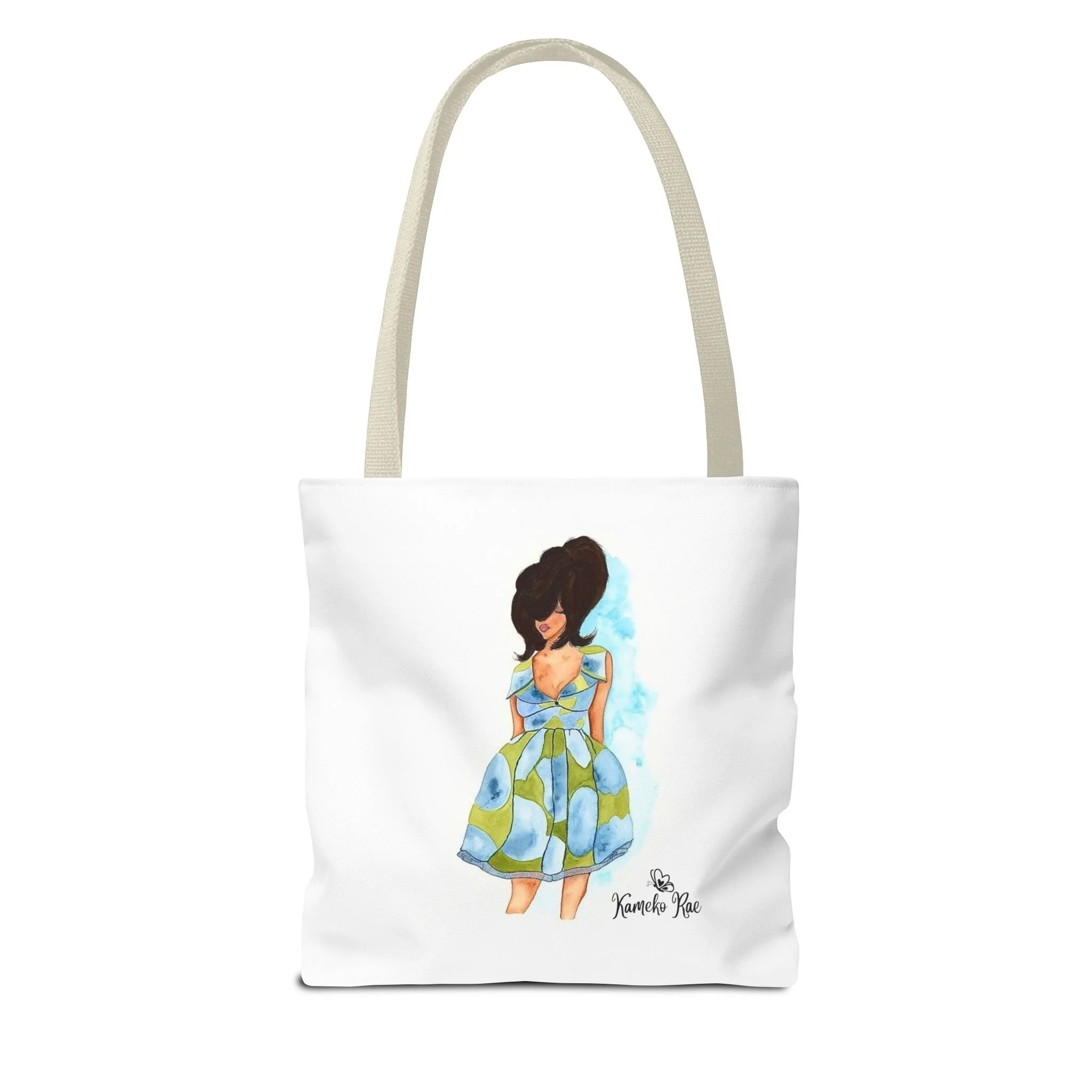 — it holds groceries, sketchbooks, or a laptop sleeve without losing its shape. The roomy boxed-corner silhouette and reinforced handles feel thoughtful and reliable; the artwork hangs like a small statement piece against the clean white background. It’s for people who celebrate bold hair, patterned fabrics, and everyday art in their daily routine.