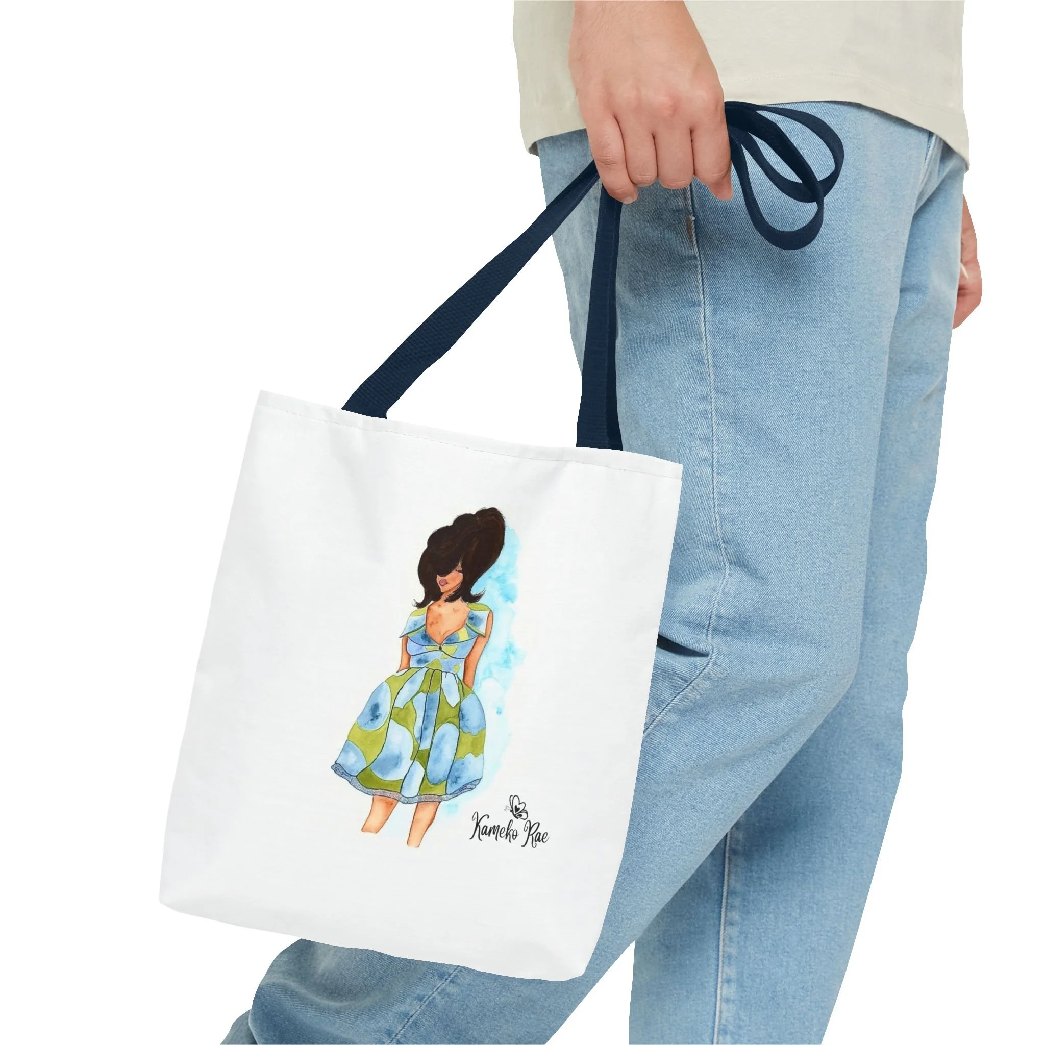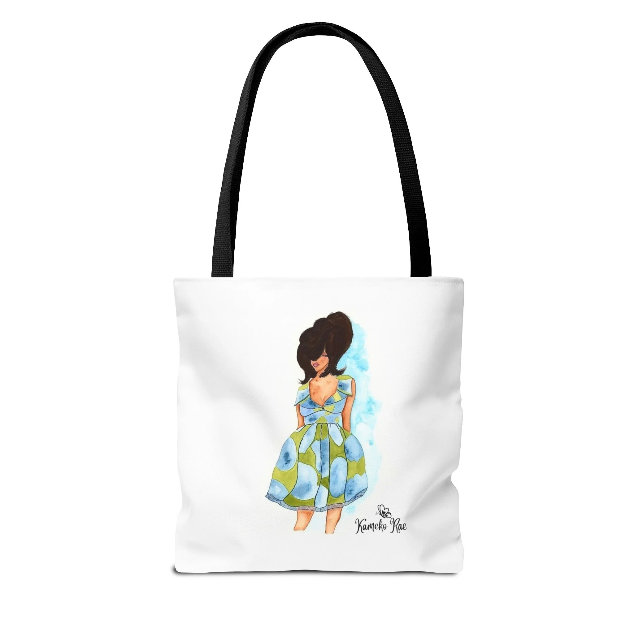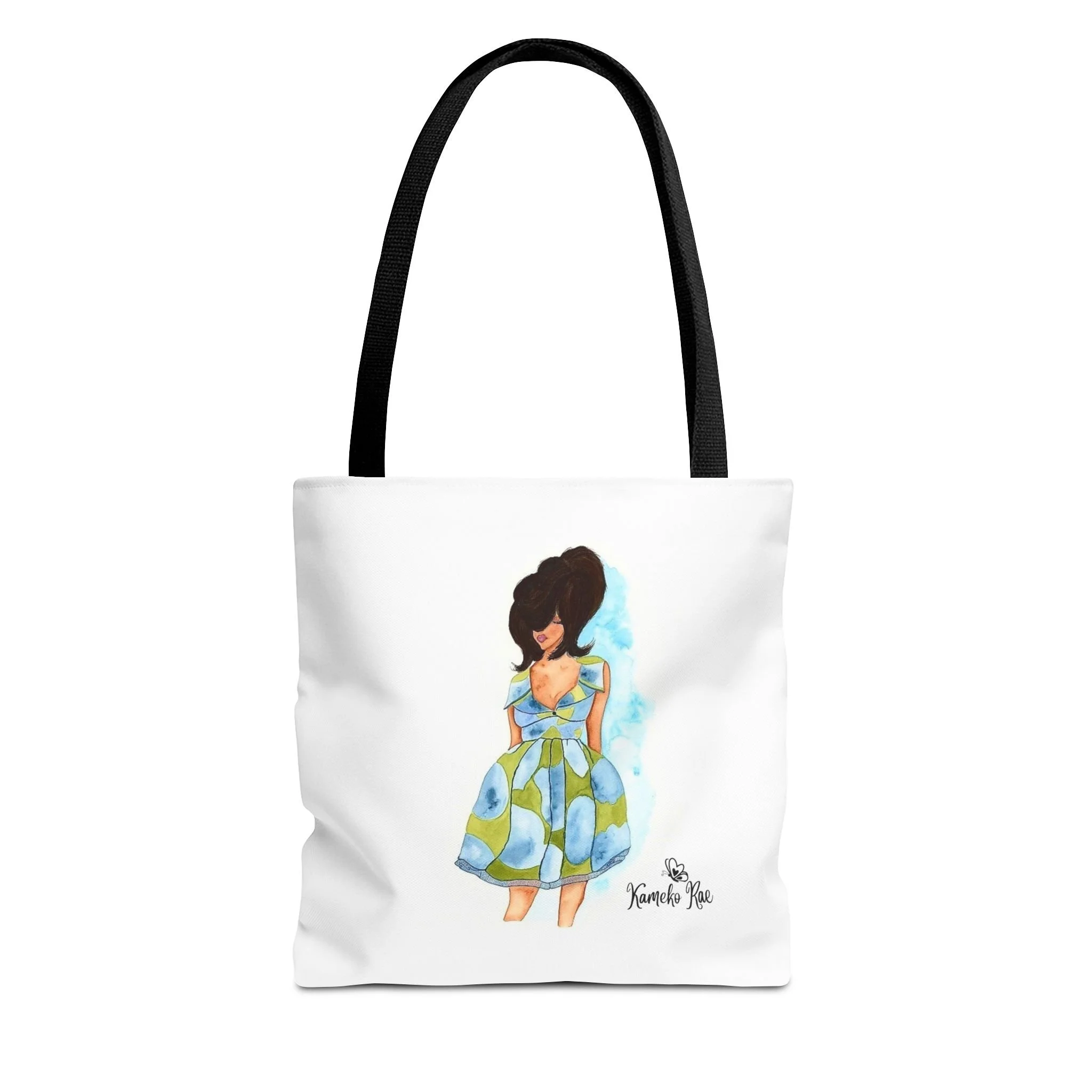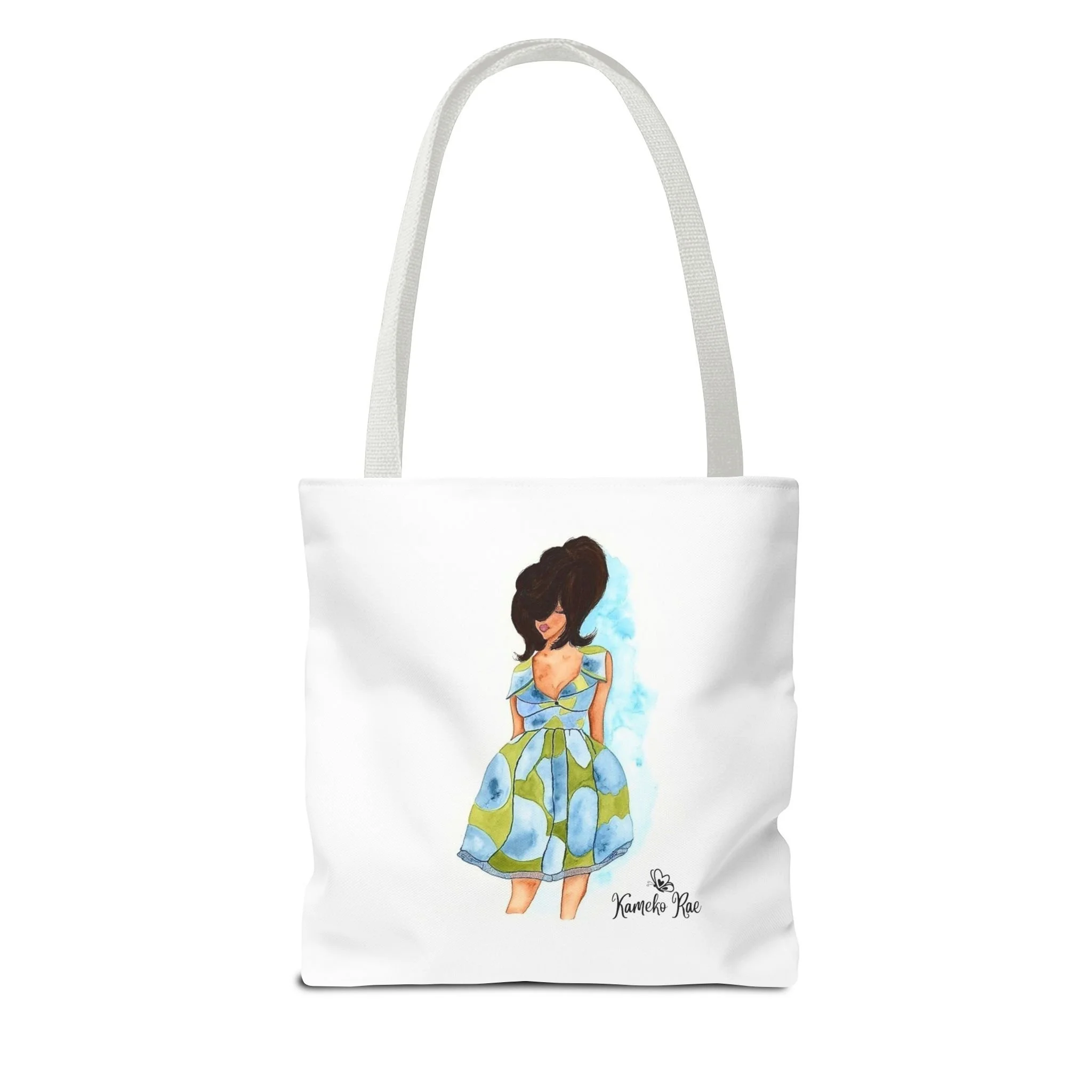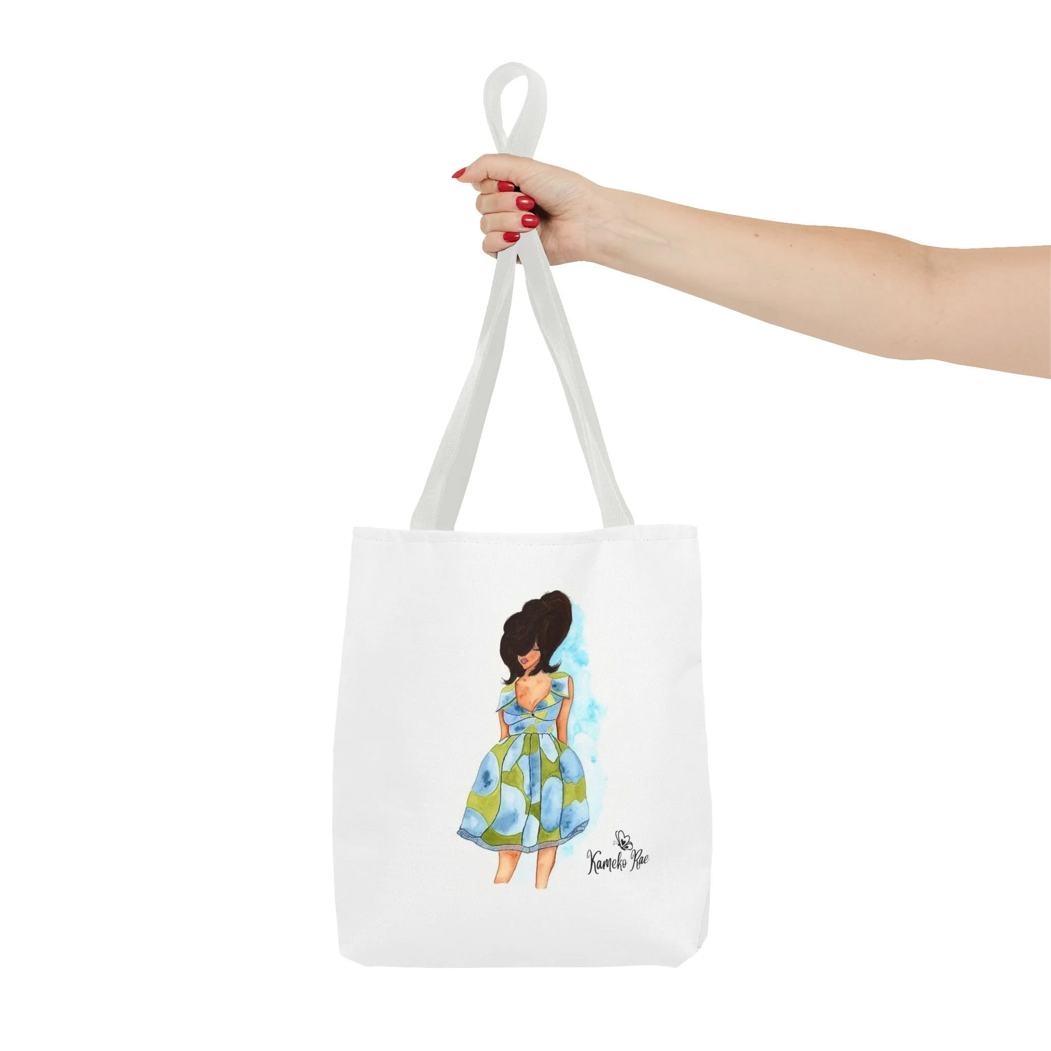 — it holds groceries, sketchbooks, or a laptop sleeve without losing its shape. The roomy boxed-corner silhouette and reinforced handles feel thoughtful and reliable; the artwork hangs like a small statement piece against the clean white background. It’s for people who celebrate bold hair, patterned fabrics, and everyday art in their daily routine.