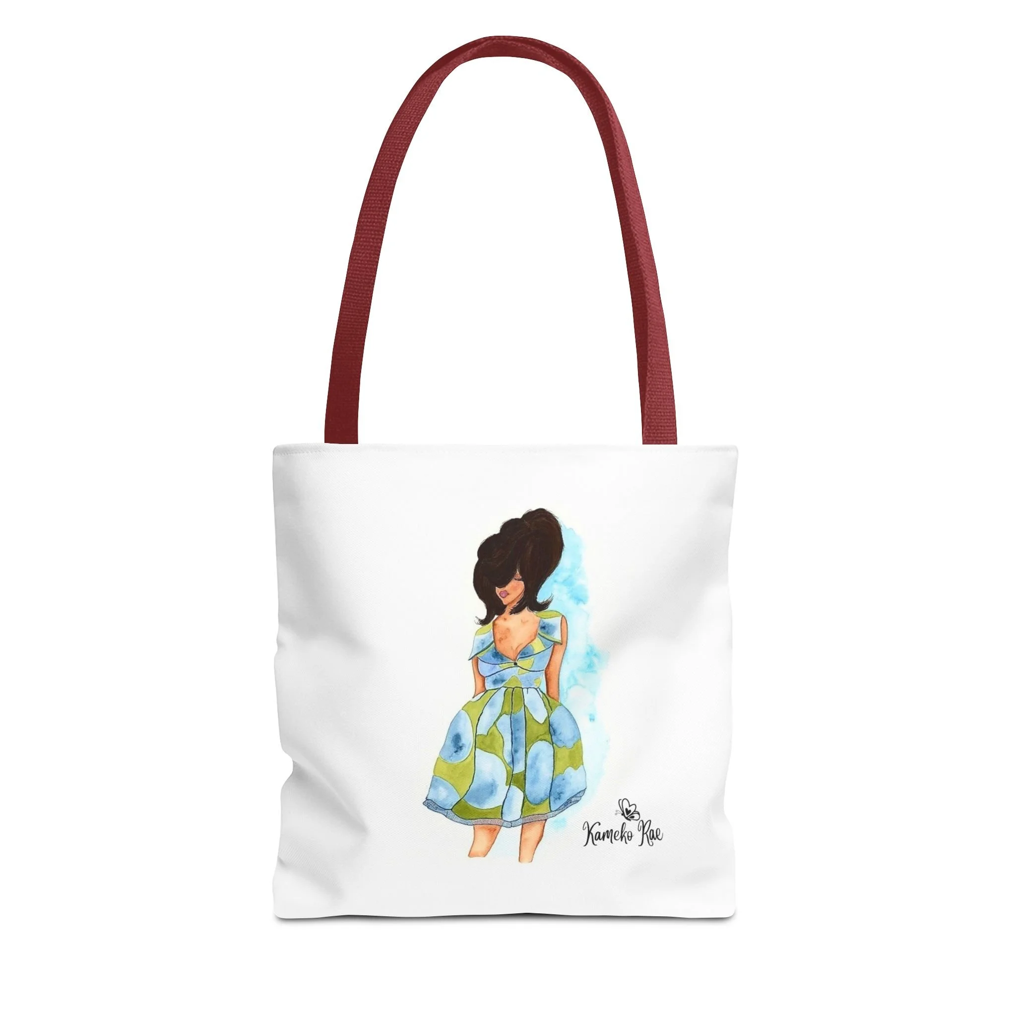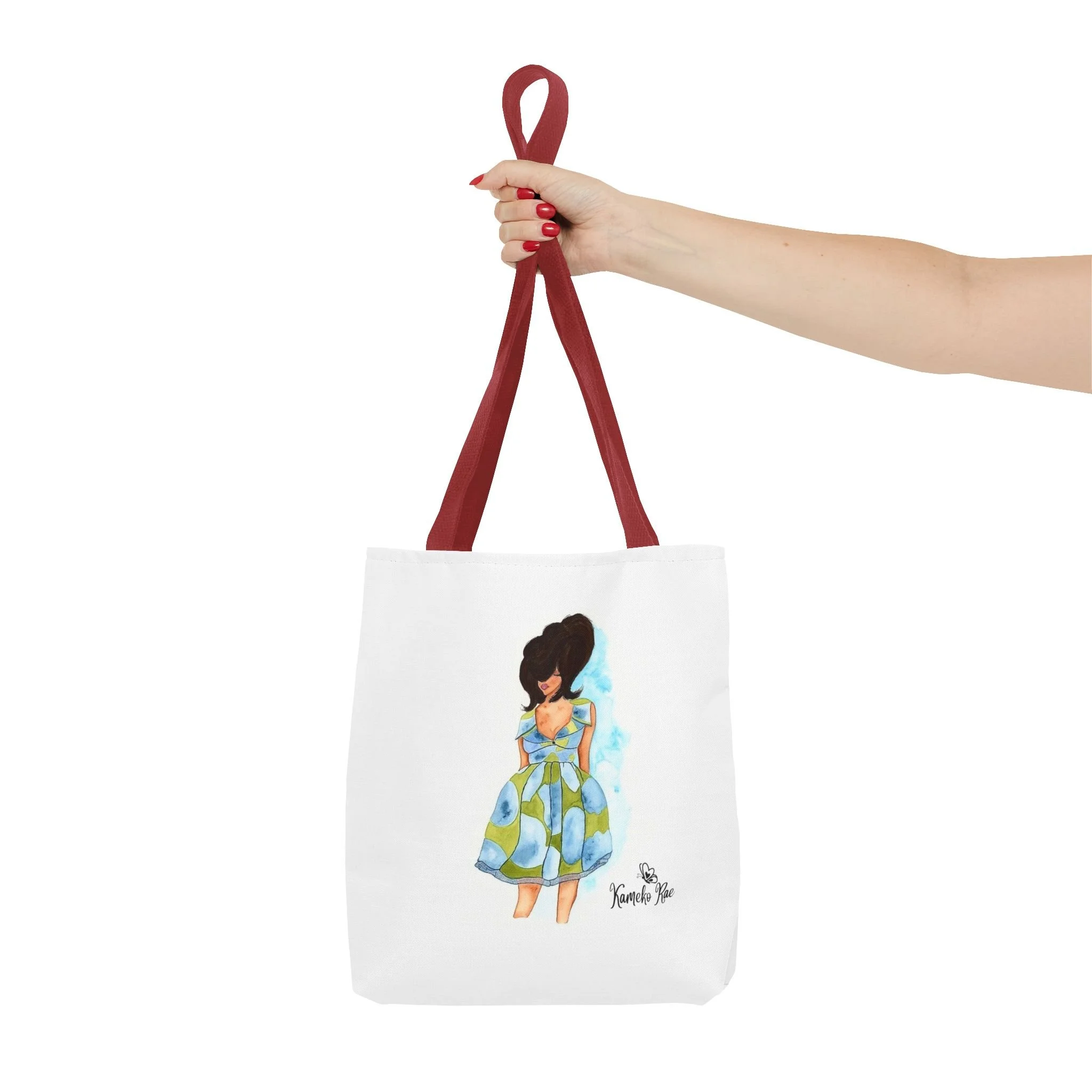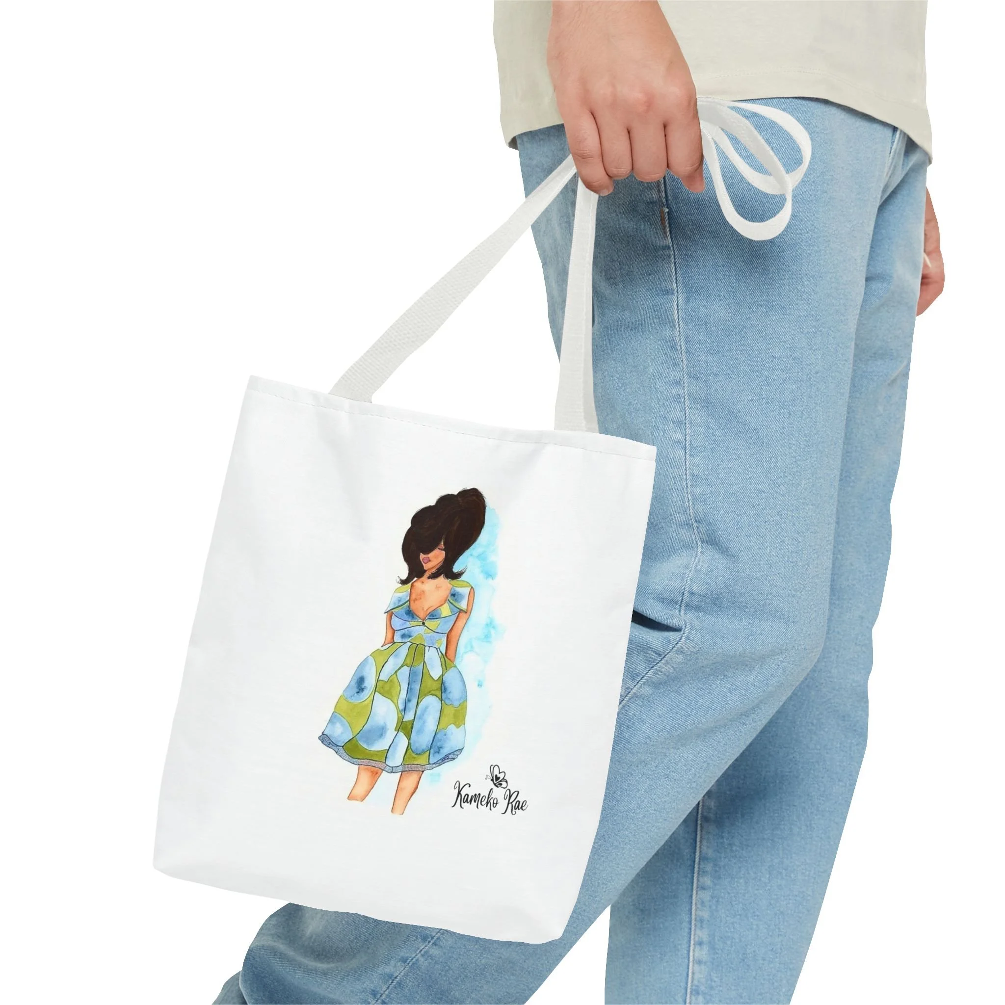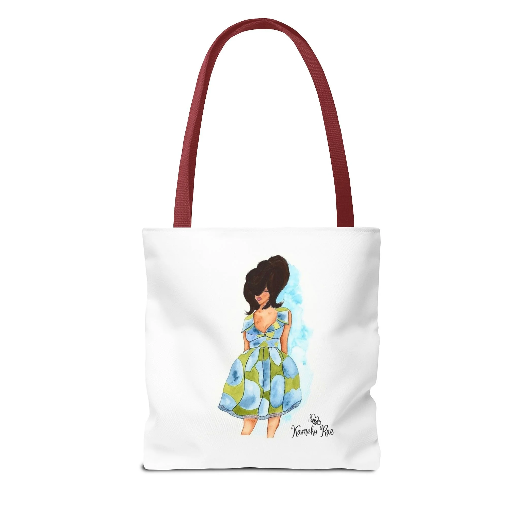 — it holds groceries, sketchbooks, or a laptop sleeve without losing its shape. The roomy boxed-corner silhouette and reinforced handles feel thoughtful and reliable; the artwork hangs like a small statement piece against the clean white background. It’s for people who celebrate bold hair, patterned fabrics, and everyday art in their daily routine.