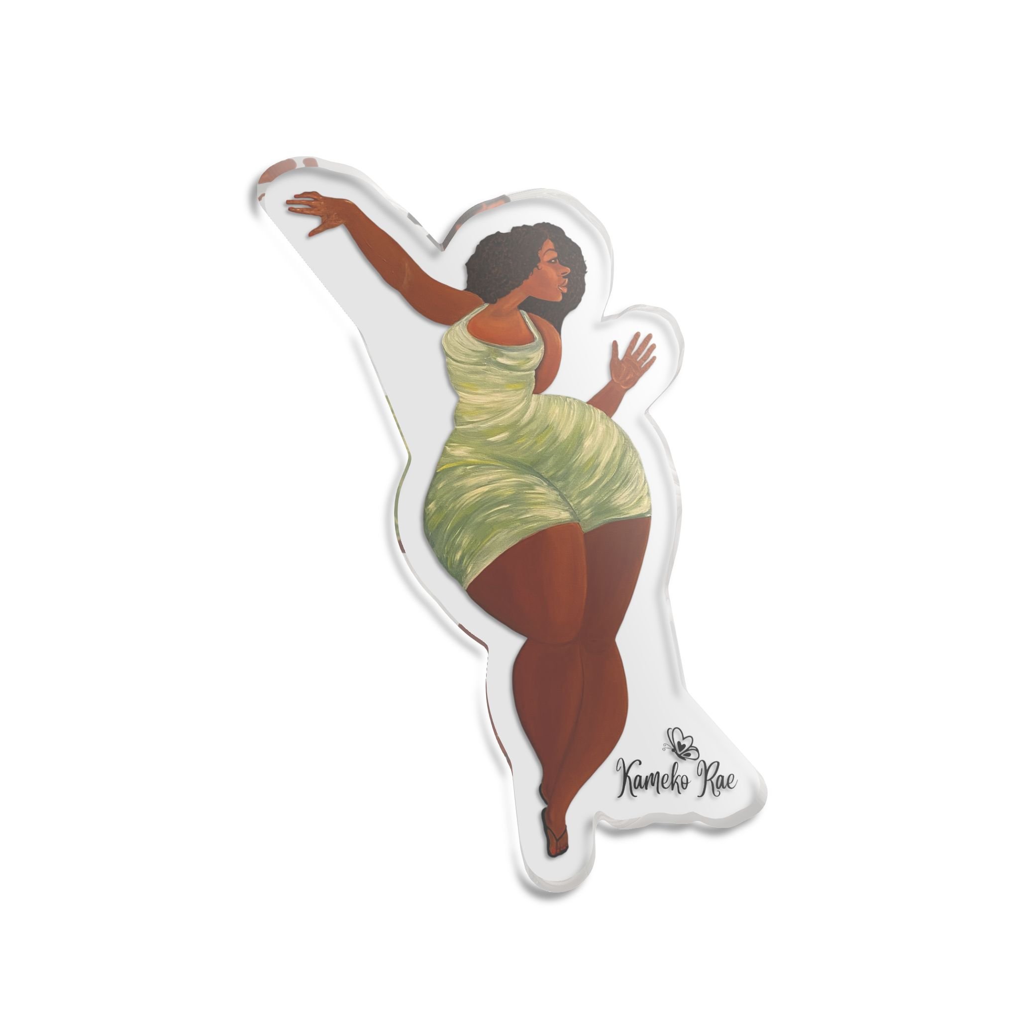A small freestanding acrylic statue that brings a moment of movement and warmth to any shelf or desk. The thick, smooth-cut acrylic holds a mirror-like print that adds subtle depth and shine to the illustration — a flowing-skirt figure with voluminous hair captured mid-breeze. It sits securely on its own, catching light and reflecting tiny highlights that change with the room. Place it on a bedside table, an art nook, or a workspace to quietly celebrate bold hair, confident posture, and everyday elegance. Made in the USA and crafted for adults, this piece feels both personal and gallery-ready without taking up much space.